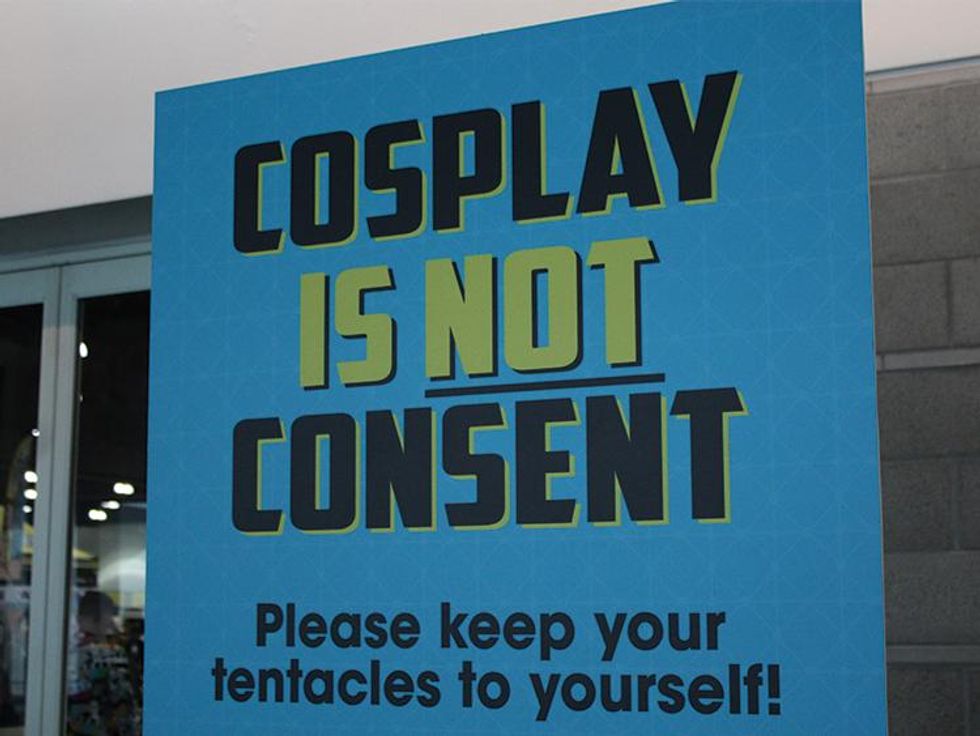 A sign outside of the convention grounds reminding attendees that just because someone is in cool and awesome cosplay, it doesn't mean you can touch or take pictures of them without their explicit consent.