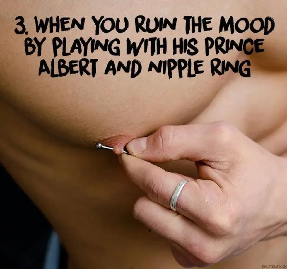3. When you ruin the mood by playing with his Prince Albert and nipple ring.