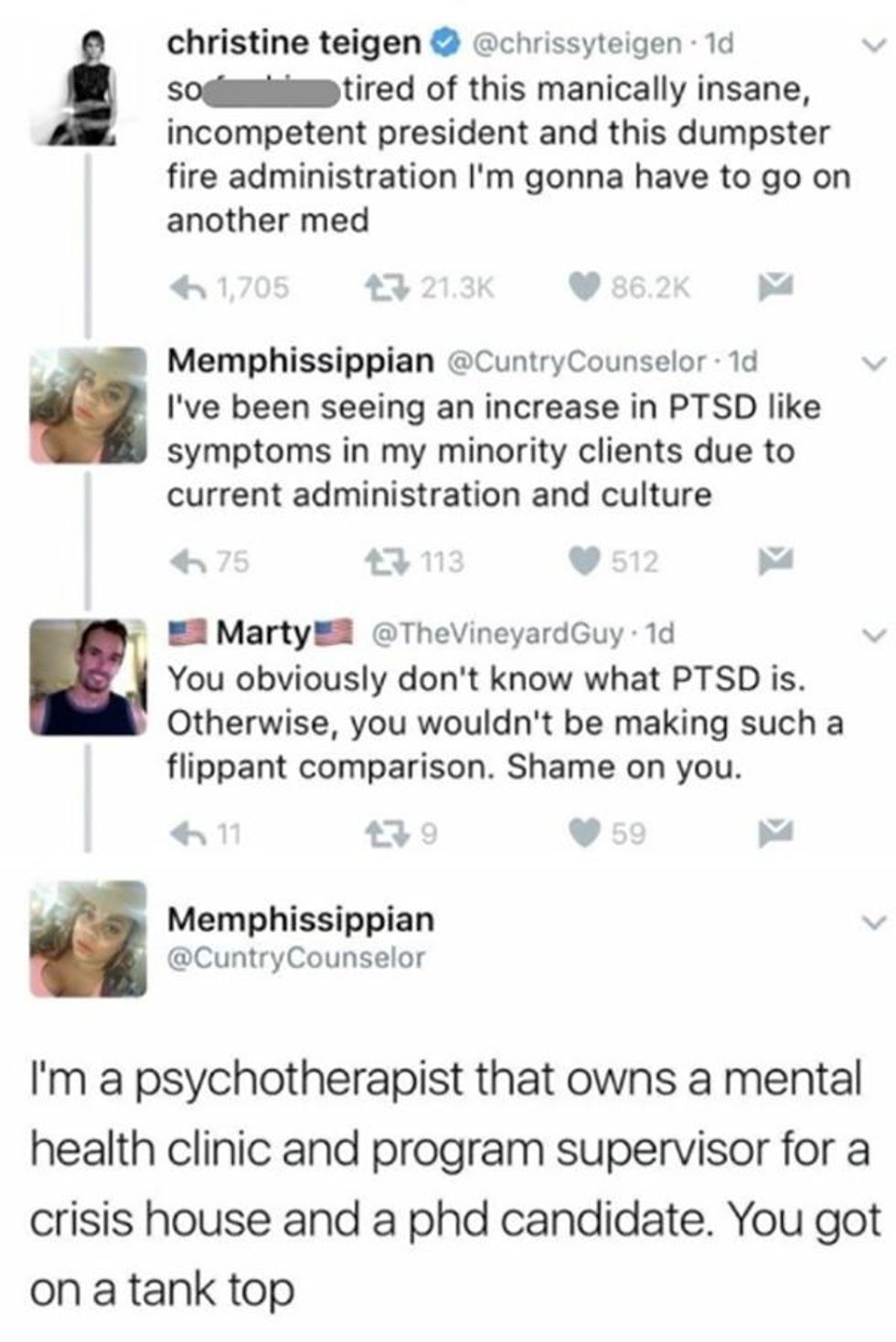 Teigen tweeted her frustration with the current administration, and in response, one of her followers with the handle Memphissippian chimed in, noting that she'd seen some of her patients display an increase in PTSD-like symptoms as a result of the Trump administration.