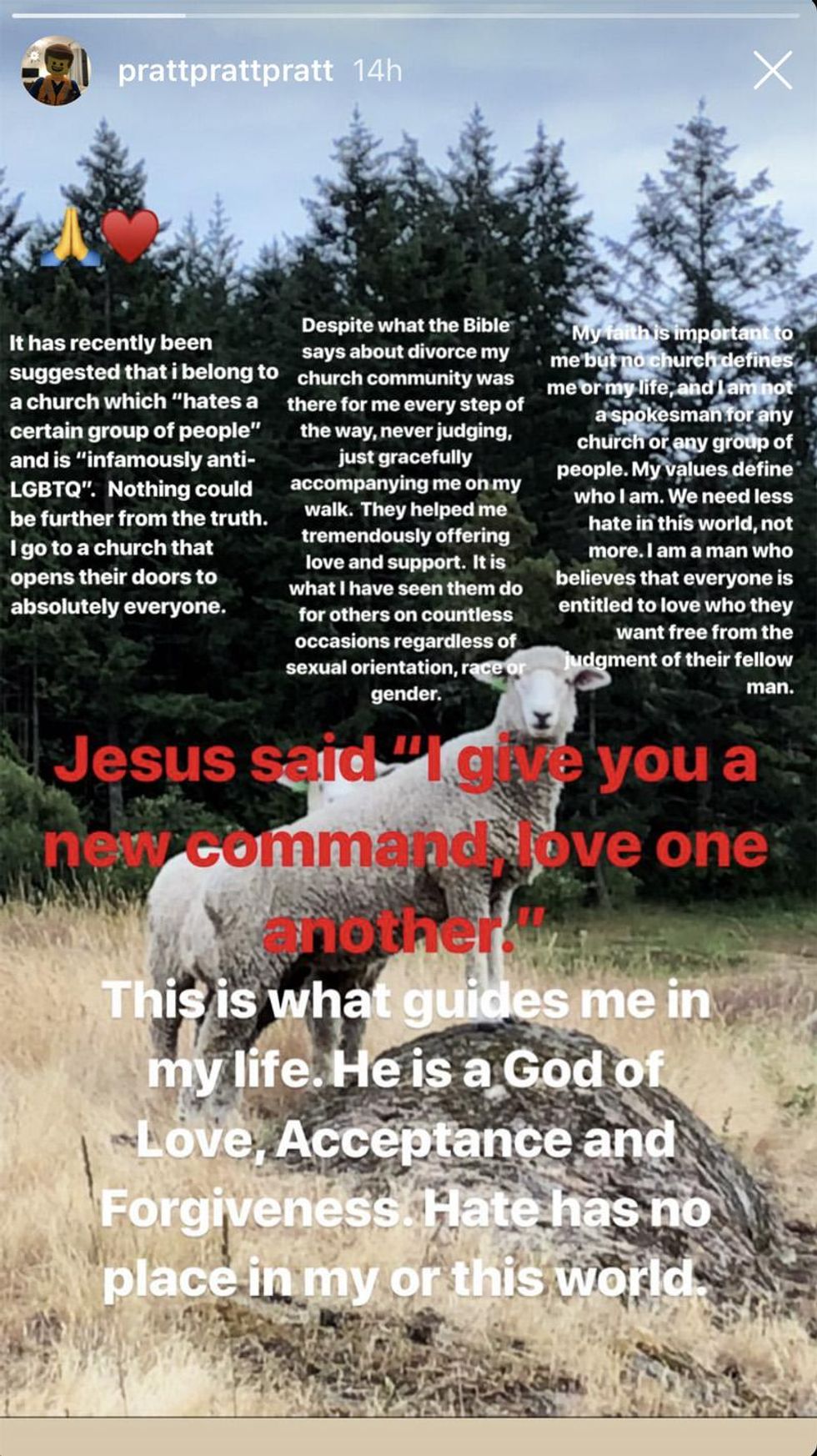 “It has recently been suggested that I belong to a church which ‘hates a certain group of people’ and is ‘infamously anti-LGBTQ,’” Pratt posted on his Instagram story. “Nothing could be further from the truth.”