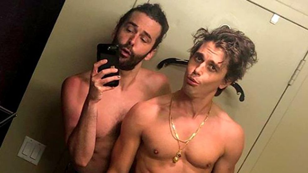 JVN posted a photo of he and Antoni looking cute and almost holding hands behind the scenes at Jimmy Fallon last night, with fellow Fab Fiver Karamo Brown giving the camera the finger in the background.