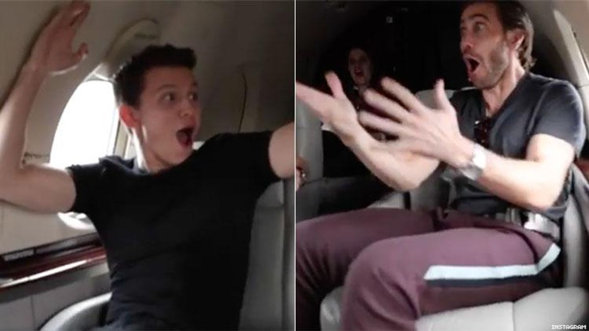 The Spider-Man: Far From Home star shared one of these rosy videos with his Instagram followers on Tuesday, and in it, he and costar Jake Gyllenhaal are playing a game of tossing water bottles into cup holders on a private plane they're sharing (along with his younger brother, Harry Holland).