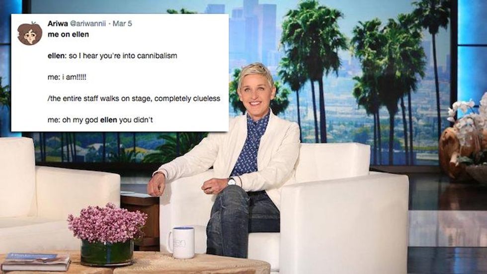 \u201cme on ellen\n\nellen: so i hear you like criminal minds!\n\nme: yes!!\n\n*serial killer walks out and murders me*\n\nme: omg ellen you didn\u2019t\u201d— a (@a) 1551674981