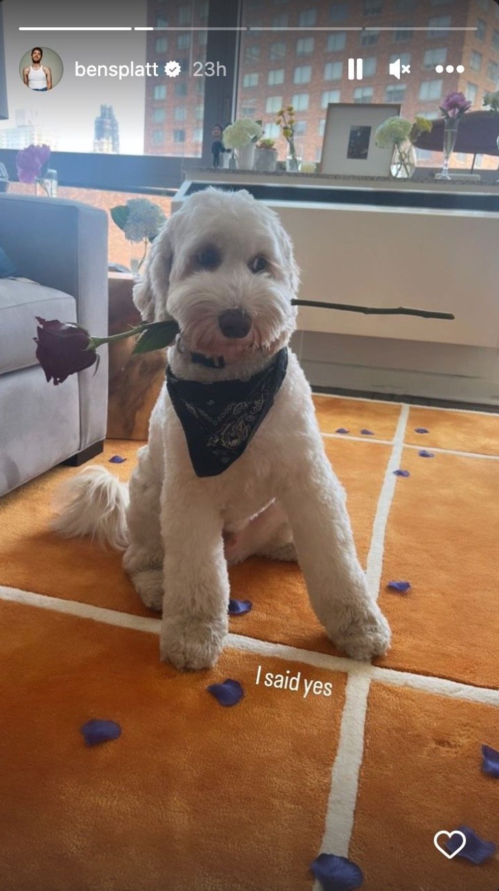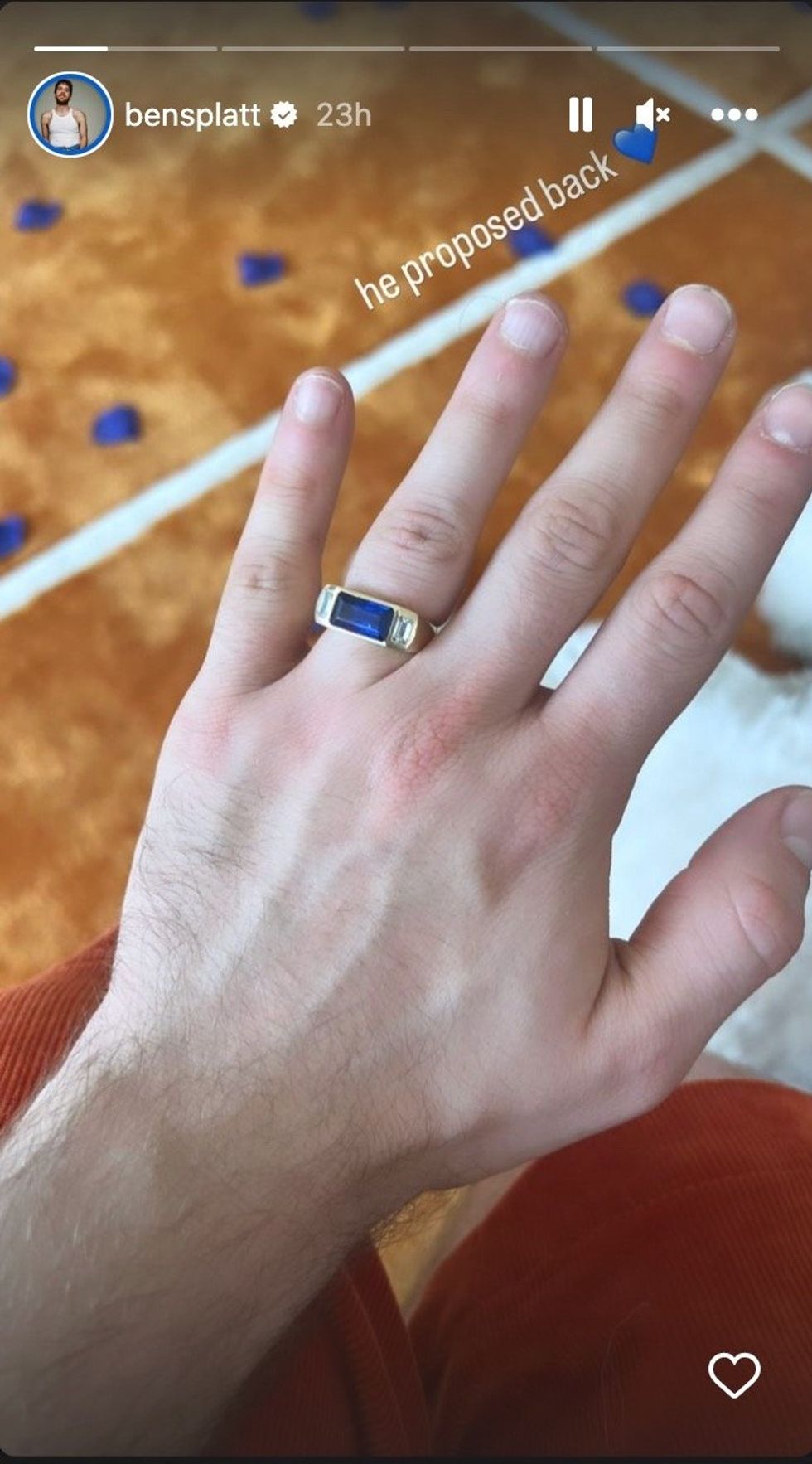 And it turns out his fiancé was just biding his time to return the romantic gesture — Platt posted a photo of his new ring to Instagram Stories on Monday.