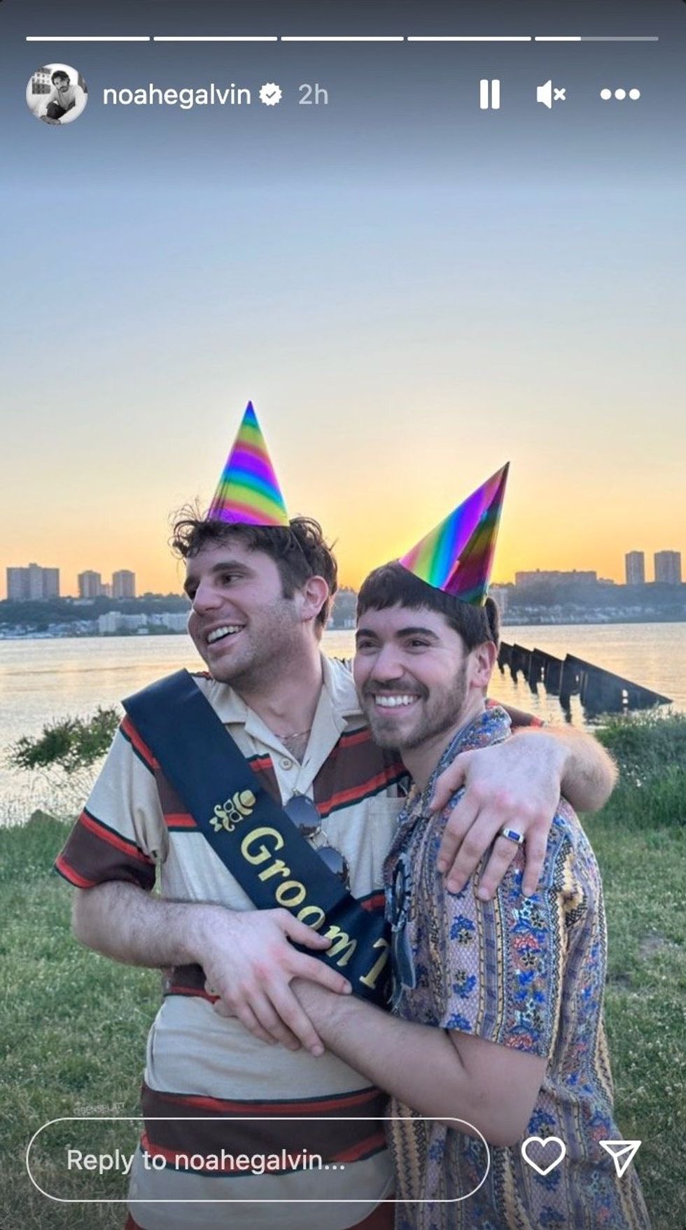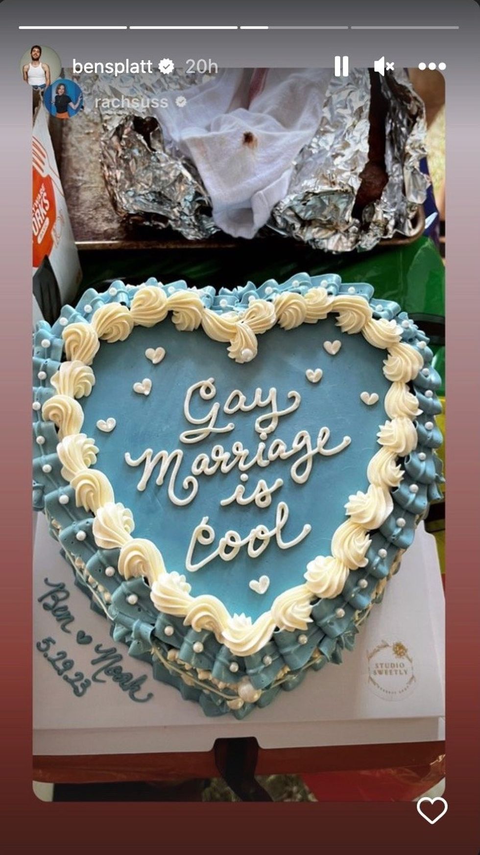 It appears the two also celebrated with friends, as pal Rachel Sussman shared a photo of a cake reading “Gay Marriage is Cool” and “Ben & Noah 5.29.23” that both actors reposted to their own Stories along with pictures of them wearing rainbow party hats and Platt donning a “Groom To Be” sash.
