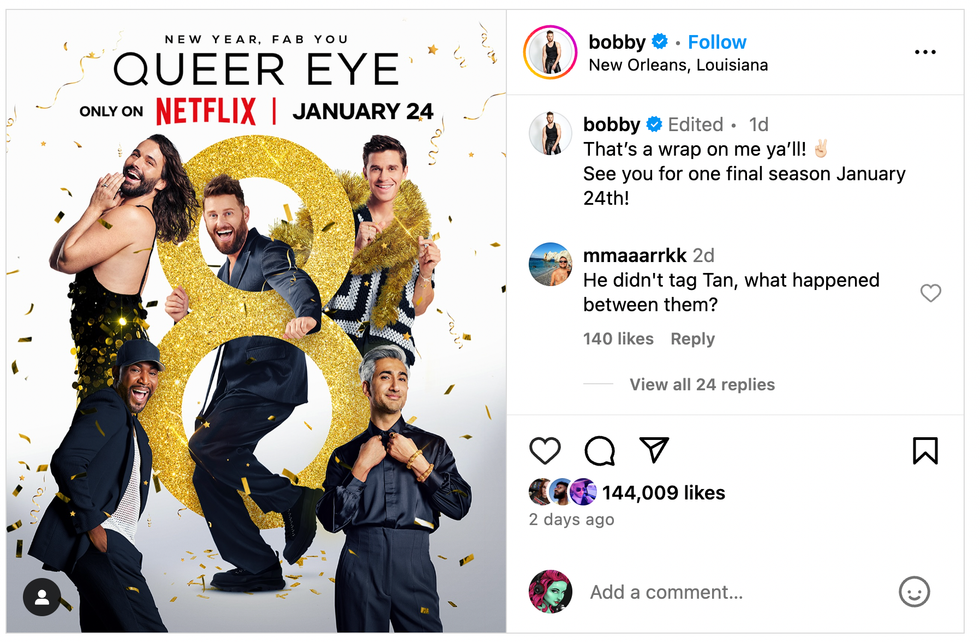 PinkNews reports that Tan France has seemingly unfollowed Bobby Berk, following the latter’s decision to leave the show after seven seasons, leading some to believe that the drama is ramping up between the former cast members. The tipping point, some speculate, was a recent IG post by Berk in which he tagged the whole cast, except for France — which was quickly pointed out in the comments.