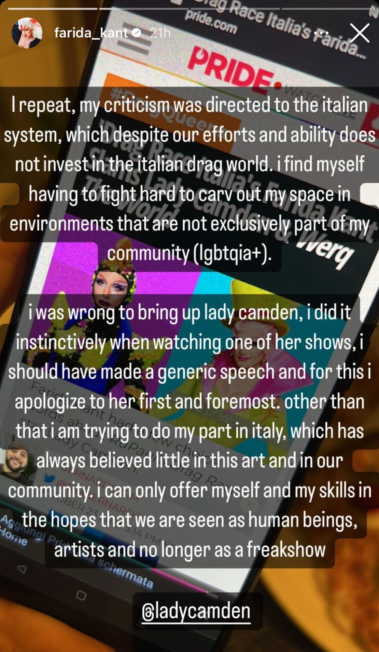 On Tuesday, October 24, the Drag Race Italia star apologized for criticizing Camden and used PRIDE’s original reporting about this situation as a background for her Instagram story.