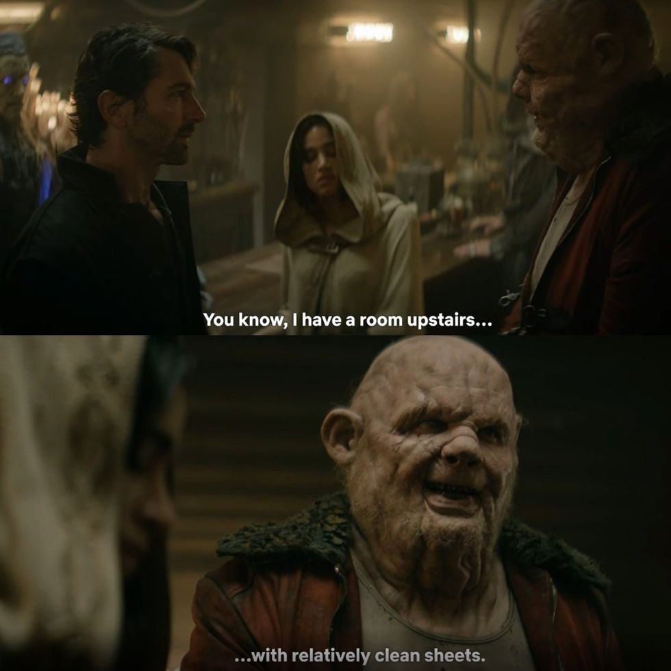 In one scene (around 49 minutes into the film), main characters Kora (Sofia Boutella) and Gunnar (Michiel Huisman) are in a bar very reminiscent of a Star Wars cantina. As they talk about their plan, a large, ugly, male alien approaches the two, licks his lips, and asks Gunnar, “Is this your owner? Everything’s for sale in this place, so, how much? You know, I have a room upstairs with relatively clean sheets.”