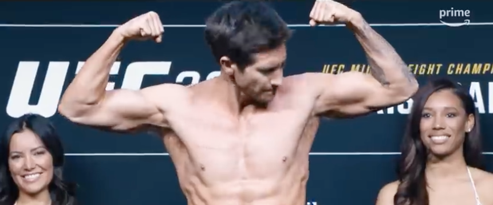 UFC star Connor McGregor is playing a UFC fighter-turned-bouncer named Knox who head butts Gyllenhaal's character in the trailer. But honestly we're mostly interested in his abs and thick thighs!