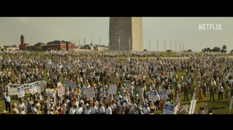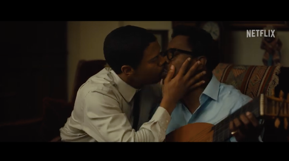 Some movies gloss over a gay person's romantic relationships, so we're excited that there was a kiss in the trailer. While we don't know who Rustin is kissing, in real life he began dating his partner Walter Naegle in 1970 and the two were together until Rustin's death.