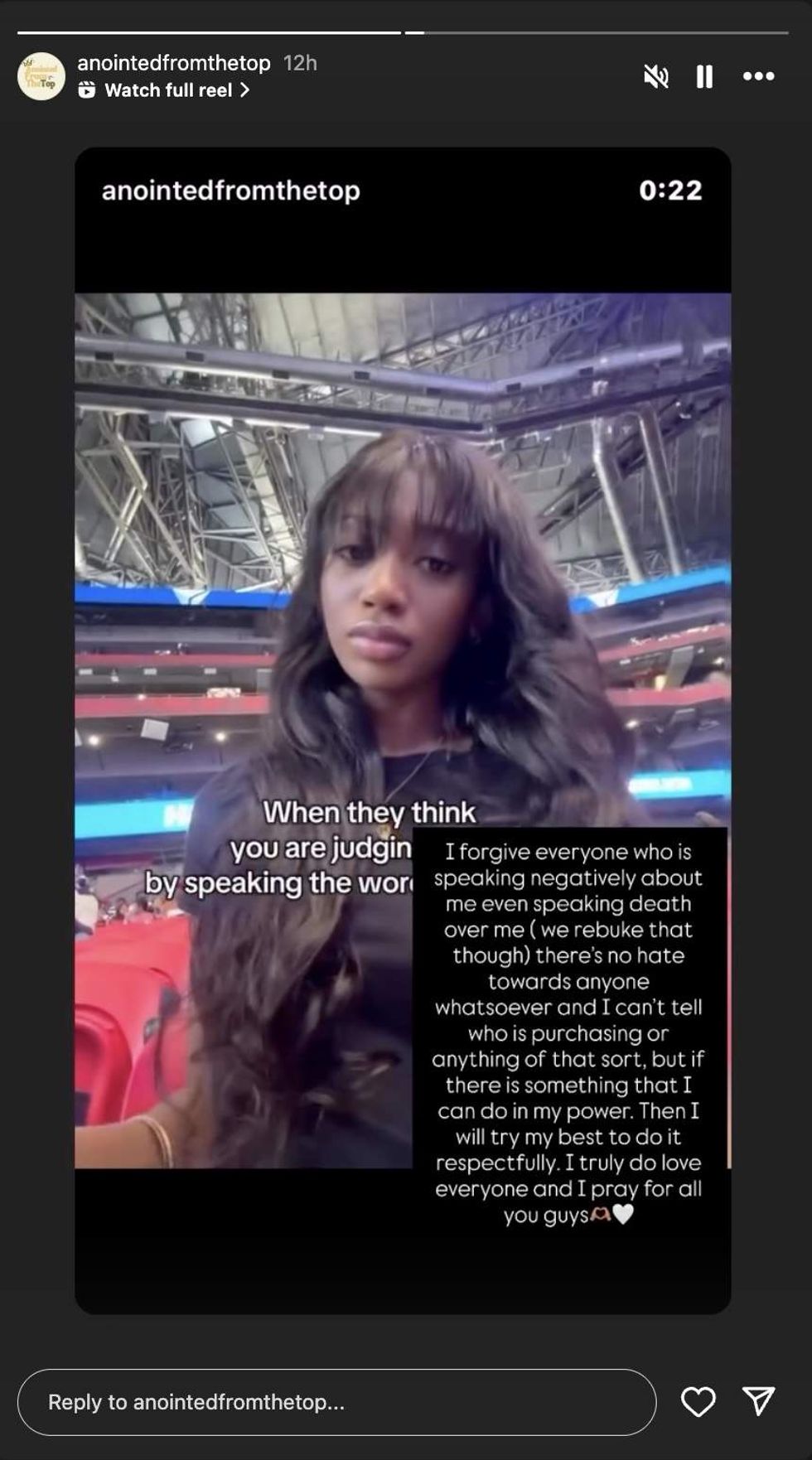 "I forgive everyone who is speaking negatively about me even speaking death over me (we rebuke that though) there's no hate towards anyone whatsoever and I can't tell who is purchasing or anything of that sort, but if there is something that I can do in my power. Then I will try my best to do it respectfully," she wrote. "I truly do love everyone and I pray for all you guys."