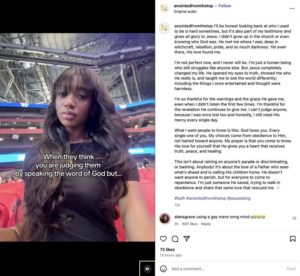 "Babe this entire video is giving jezebel spirit but off I guess," @muffie_in_bloom wrote on the post @anointedfromthetop seemingly made in response to the backlash. "You claim you're doing the lords work while posting clips of you showing off your body seductively. Your religion condemns that. They would stone women to death for it. You can't pick and choose which sin matters more."