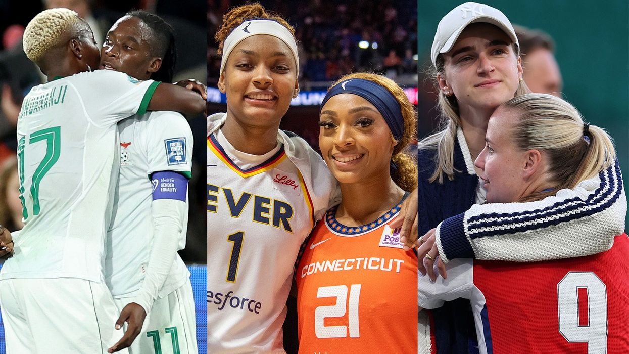 Lesbian and sapphic athletes celebrating with their partners.Footage still via Instagram @redrosesrugby; Daniela Porcelli/Getty Images; Kevin C. Cox/Getty Images