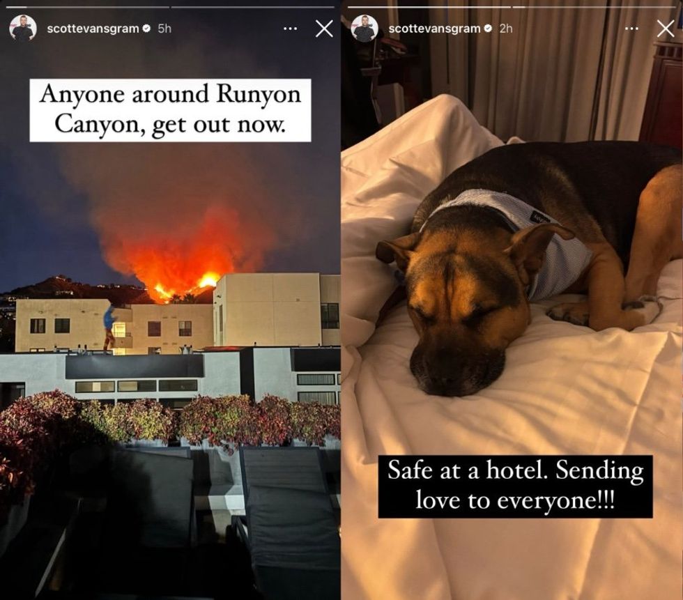 Out actor Scott Evans shared that he evacuated his home along with his dog to a hotel and were safe. He also shared a shocking video of the popular hiking area Runyon Canyon ablaze with the caption “Anyone around Runyon Canyon, get out now.”