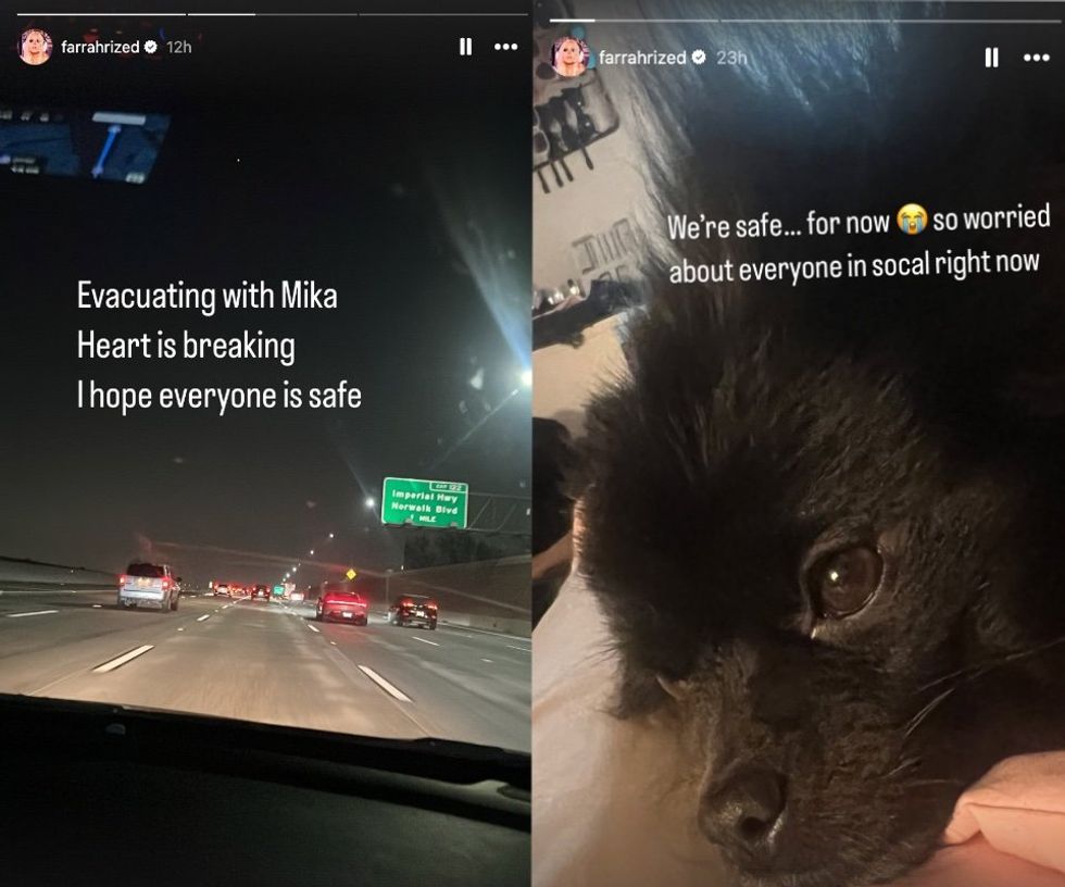 RuPaul’s Drag Race star Farrah Moan posted a series of stories detailing her evacuation with her dog Mika. The two made it safely to a hotel.