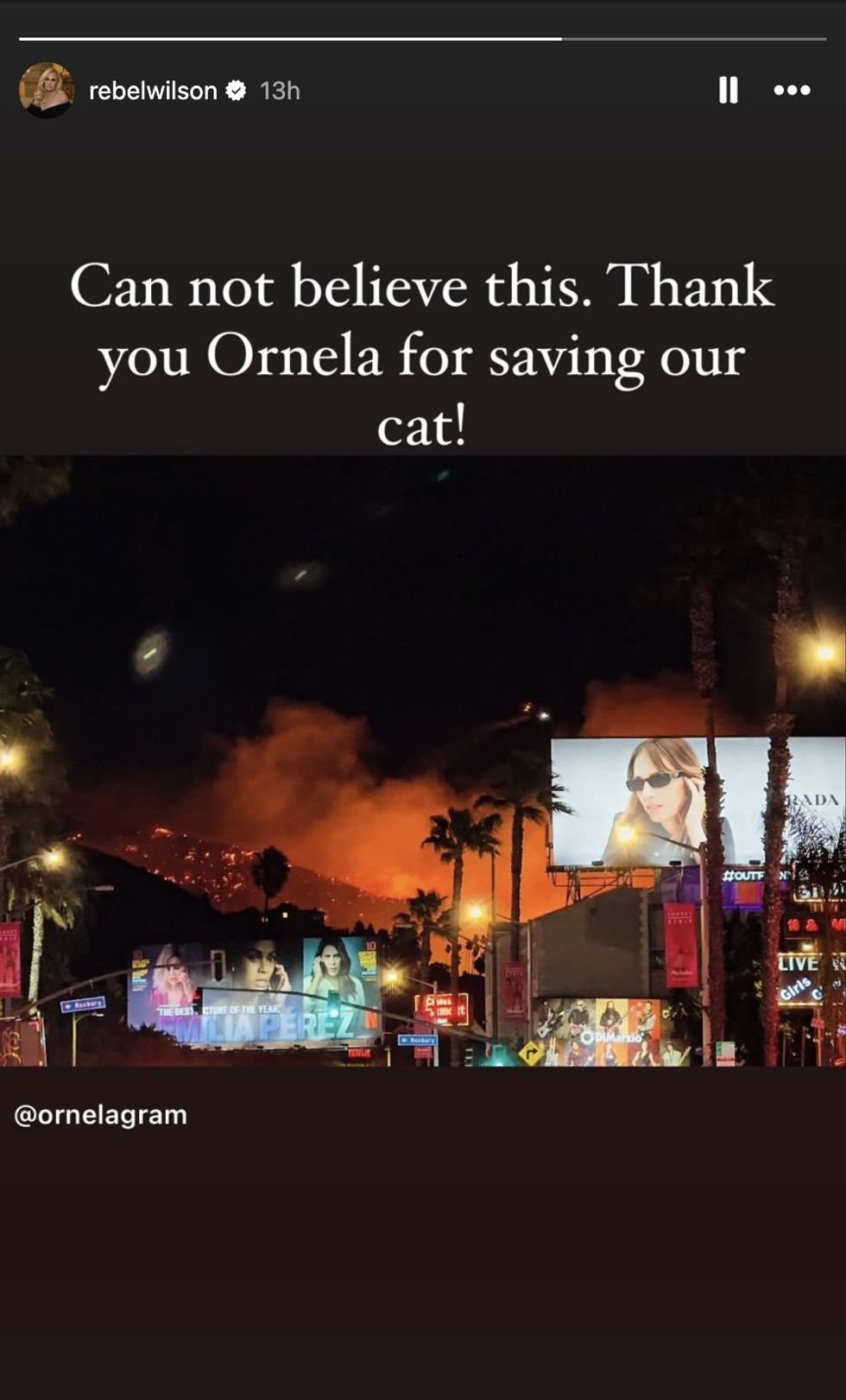The out actor Rebel Wilson posted a photo of the fire on her Instagram Stories thanking her friend Ornela for saving her cat.