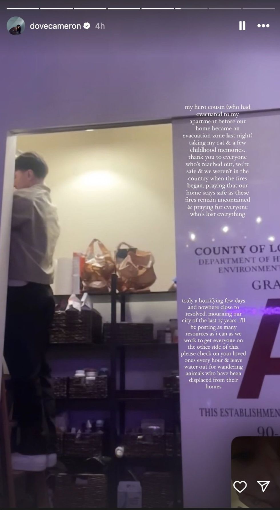 Queer singer Dove Cameron shared that while she was out of the country her cousin who first fled to her home was now evacuating again. She shared a photo of him packing things up. “Taking my cat & a few childhood memories. Thank you to everyone who’s reached out, we’re safe & we weren’t in the country when it began. Praying that our home stays safe as these fires remain uncontained & praying for everyone who’s lost everything.”