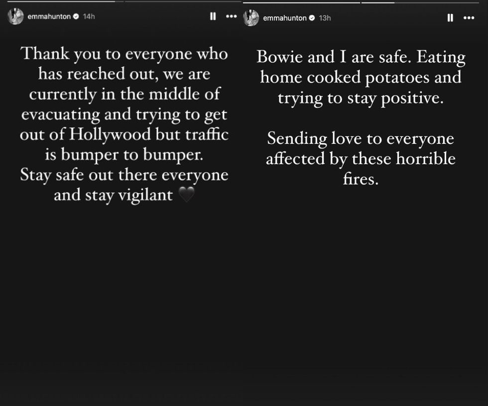 “Thank you to everyone who has reached out, we are currently in the middle of evacuating and trying to get out of Hollywood but traffic is bumper to bumper. Stay safe out there everyone and stay vigilant,” she wrote in her first Story. “Bowie and I are safe. Eating home cooked potatoes and trying to stay positive. Sending love to everyone affected by these horrible fires.” she later added.