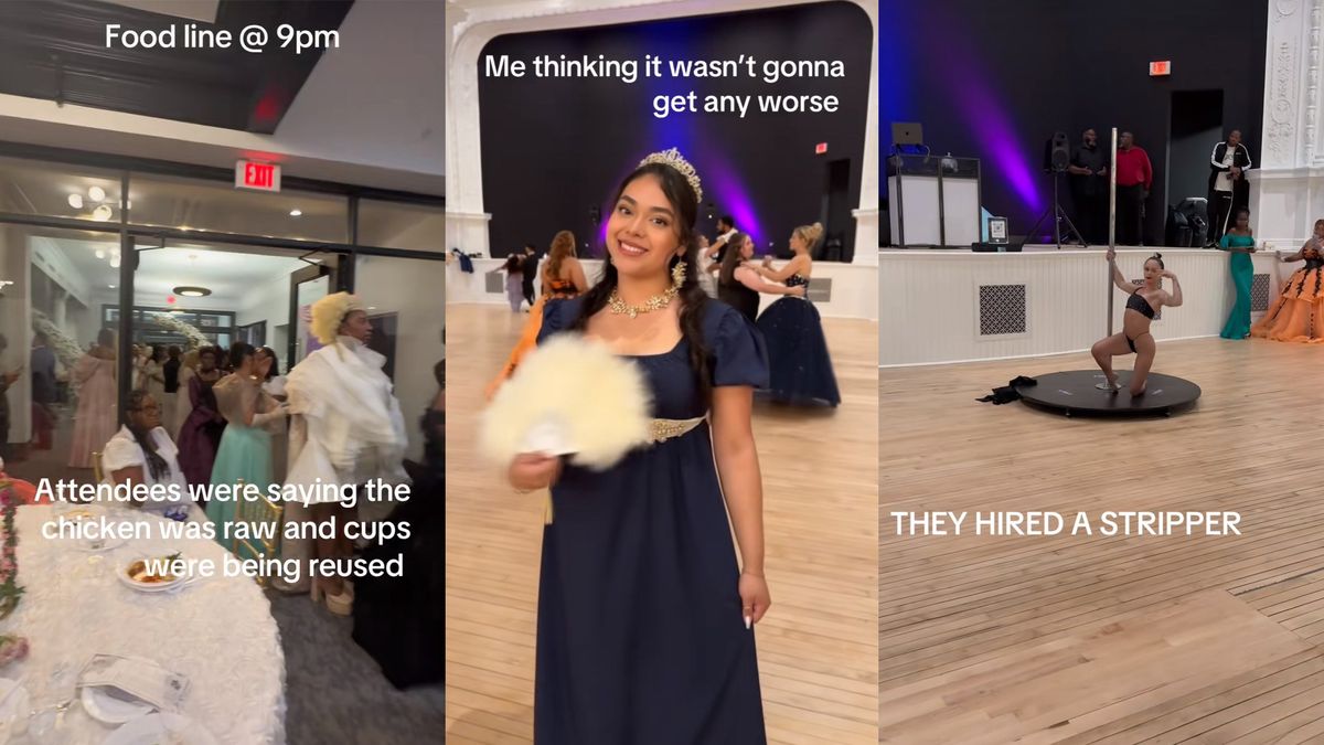 Instead of the glitz and glamour fit for a queen, people who bought tickets for the "Bridgerton Ball" were greeted by a nearly empty event hall with no seating that left decked-out attendees sitting on the floor, a pathetic grass background for photos, raw chicken dinners, and to top it all off, the only entertainment provided was a single pole-dancing stripper and a lone violinist.