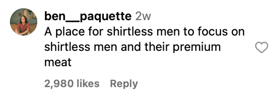 The company’s bizarre ad was posted four weeks ago and has been inspiring people to run to the comment section with hilarious jokes ever since. “This is for men who share their meat,” one person commented, while another wrote, “I bet this place smells like Axe/Lynx deodorant spray and sounds like Joe Rogan podcasts.”