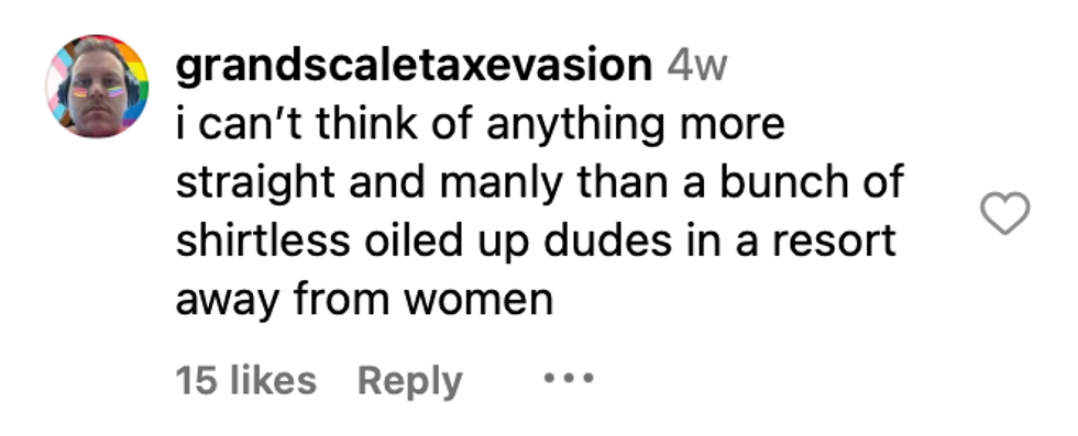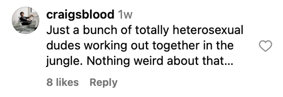 The ad leans hard into the idea that it’s for alpha men and says that the immersive retreat was “designed for athletes and entrepreneurs who want to focus on their health and remove all distractions,” eat “premium meat,” and “network with other men on the same journey.” Clearly, there wasn’t a gay man in the board room, or someone would have pointed out the obvious sexual innuendos, and the fact that the men in ad look like they're eye f—king each other in the gym — you know, an activity straight guys are known for.