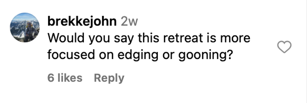 Other people asked the important questions that are on everyone’s minds, like, “Do they have hard core gay sex too? Is it included in the base price or do I have to pay extra?” And, “Would you say this retreat is more focused on edging or gooning?”