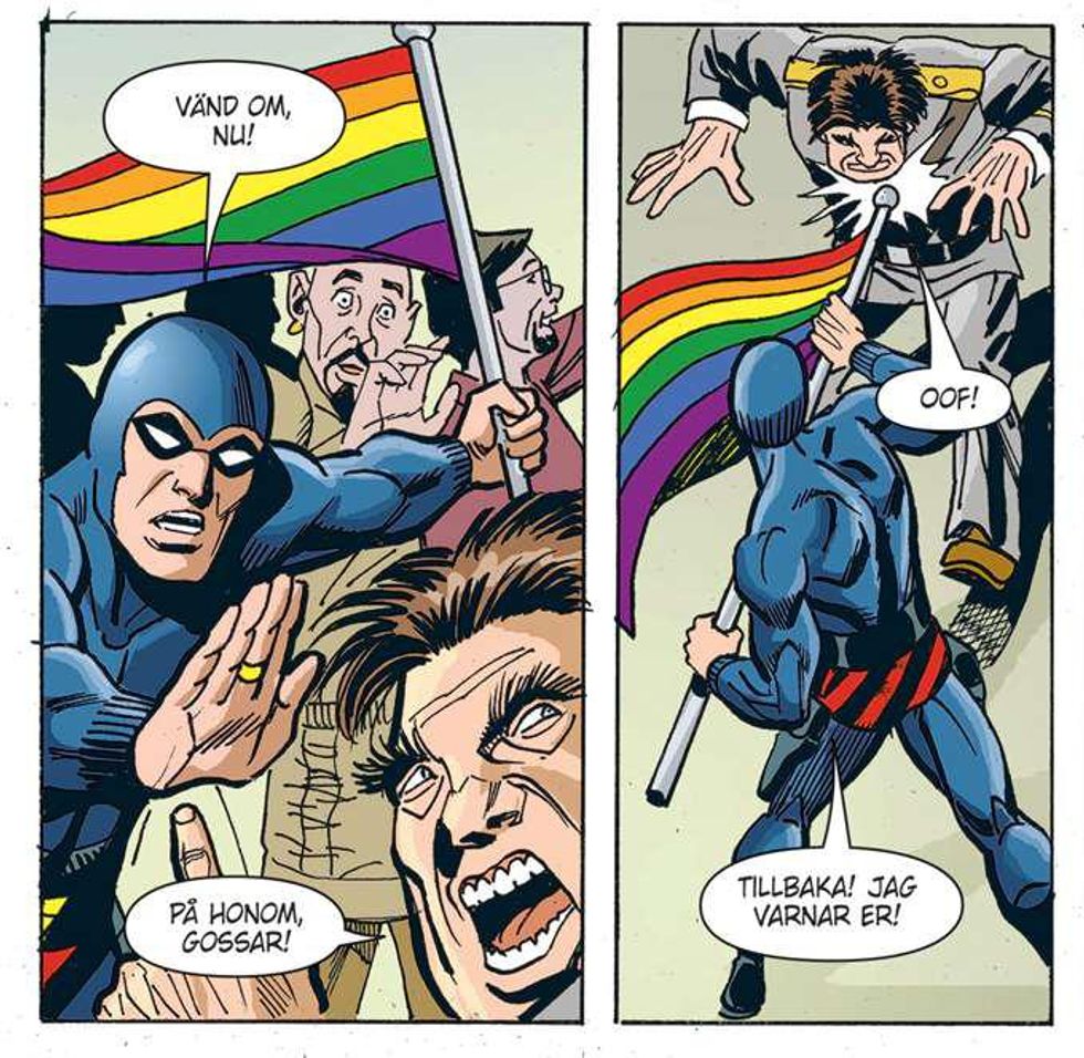 "I have to act quickly before blood flows on the streets!" And with that, The Phantom (or as he’s called in Sweden, Fantomen) grabs a rainbow-colored Pride flag (literally) and starts swinging.