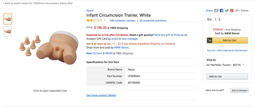 While the kit is ostensibly marketed to the medical education sector and states in its product copy, "this Infant Circumcision Trainer, White is an excellent addition to your classroom," many fear the unregulated sale of the kit.