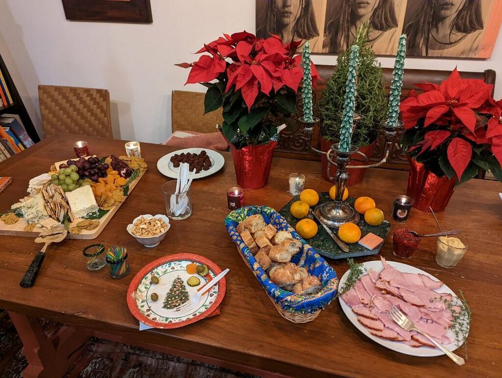 Everyone loves food, especially during the holidays! The first hack is a simple philosophy: make a lot of a little. What the heck does this mean? Very simply, don't overwhelm yourself or your guests with too much on the food menu. So cut it back and load it up. In other words, consider platters such as a cheese plater loaded with 5 or six different cheeses, including hard and soft options, arranged around a mound of fresh grapes and garnished with dried apricots and crackers. Trader Joe's has a wonderful selection of inexpensive yet luxurious tasting cheese selections. Consider also making a large spiral ham that only takes a few hours to heat up and make a platter with a selection of sliced breads and mustards for people to create their own small sandwiches. To finish up, consider buying a section of cookies and creating a platter with a selection of the cookies. No need for utensils! Now, another related hack is source different food items to guests who always insist on bringing their favorites. My sister-in-law, Mikol Kelley, points out that this typically results in a lot of "little" dishes and suggests putting a smaller soup or similar size spoon in the dishes so everyone can fit all the delicacies on their plates! Brilliant!