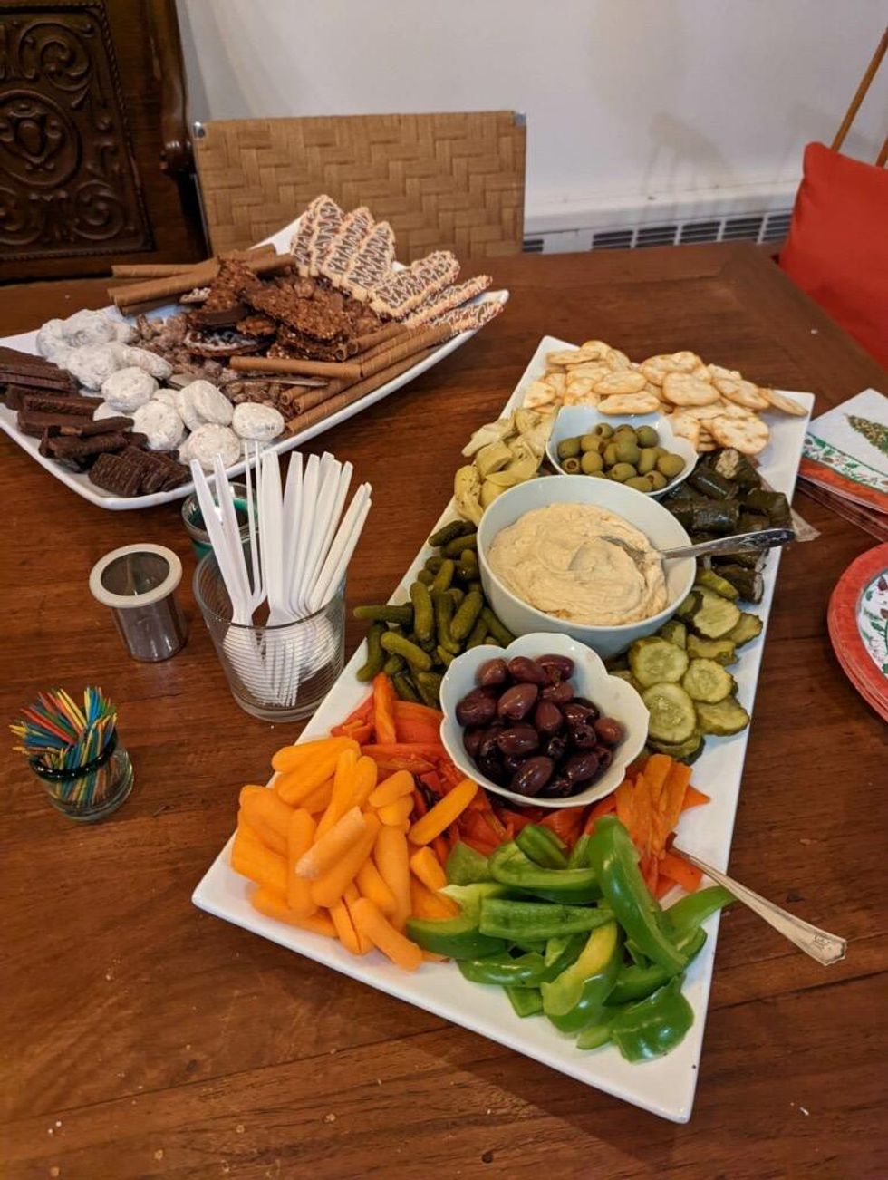 Trader Joe's, Whole Foods, Walmart Neighborhood Market and even, your local specialty food stores are your best friends! From spiral ham to a cheese board and cookie platter, the best cooking is no cooking! Buying premade cheeses, spreads and confections will make your life so much easier and everyone loves your ingenuity! So leave the cooking to the experts and make yourself the assembler of beautiful dishes that can be done ahead and feed the entire party for less! A great example pictured is a Mediterranean platter of humus, grape leaves, roasted peppers, olives, pickles and pit chips is always a hit especially for vegans.