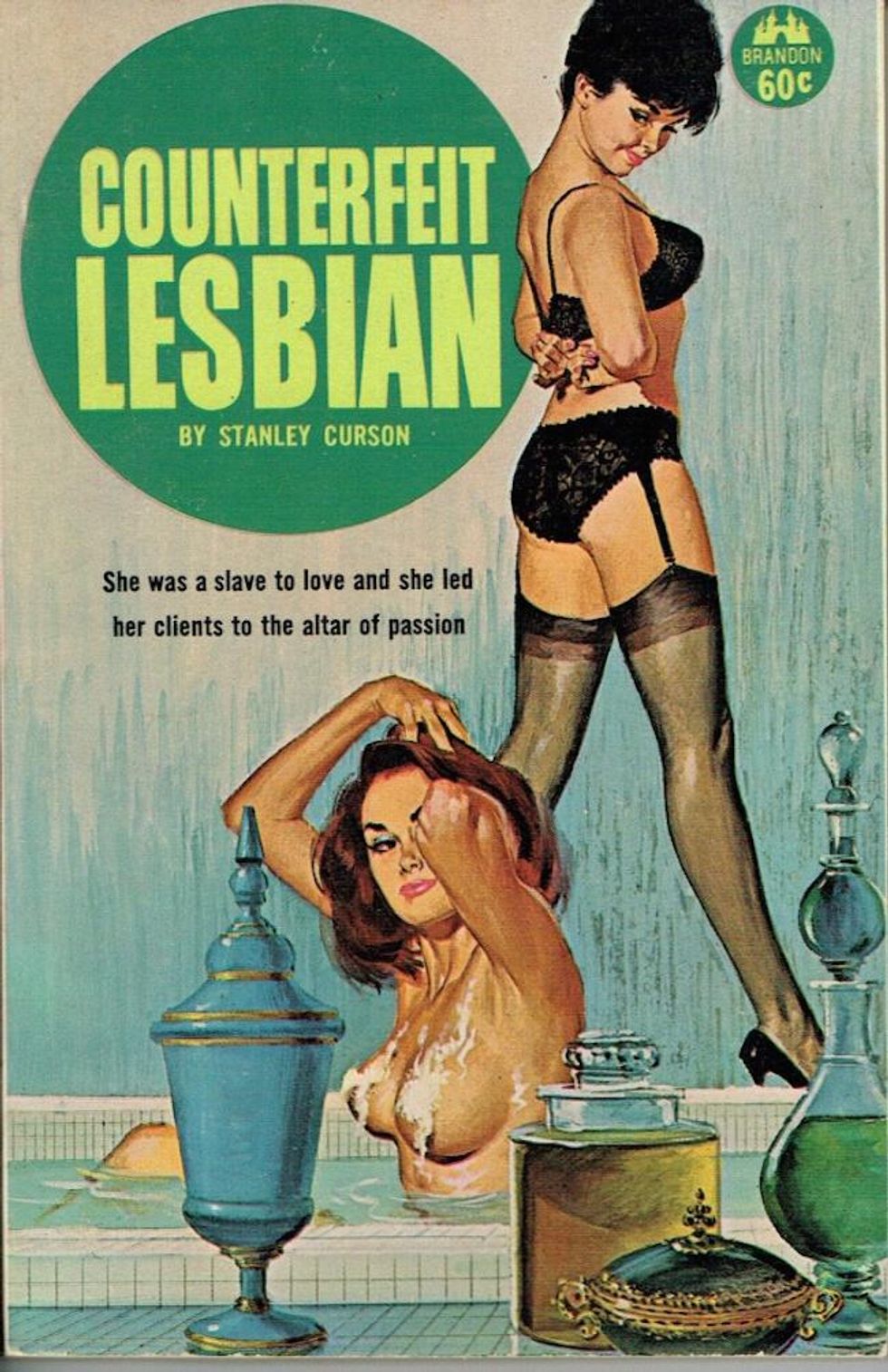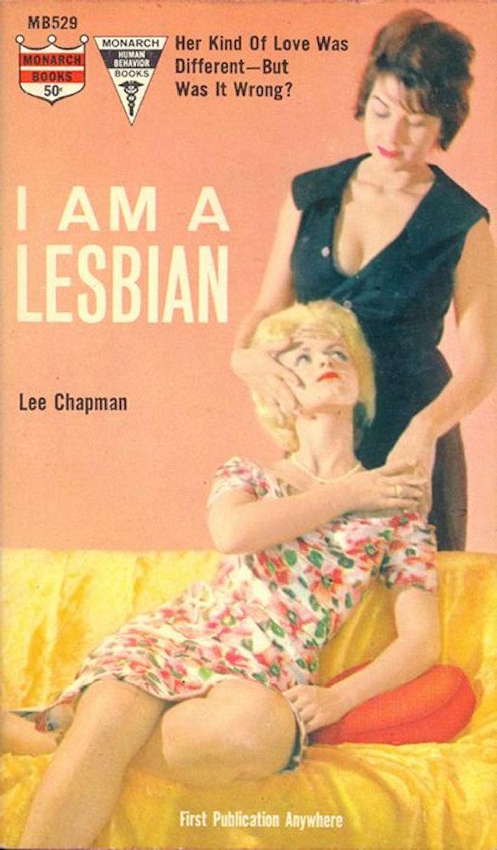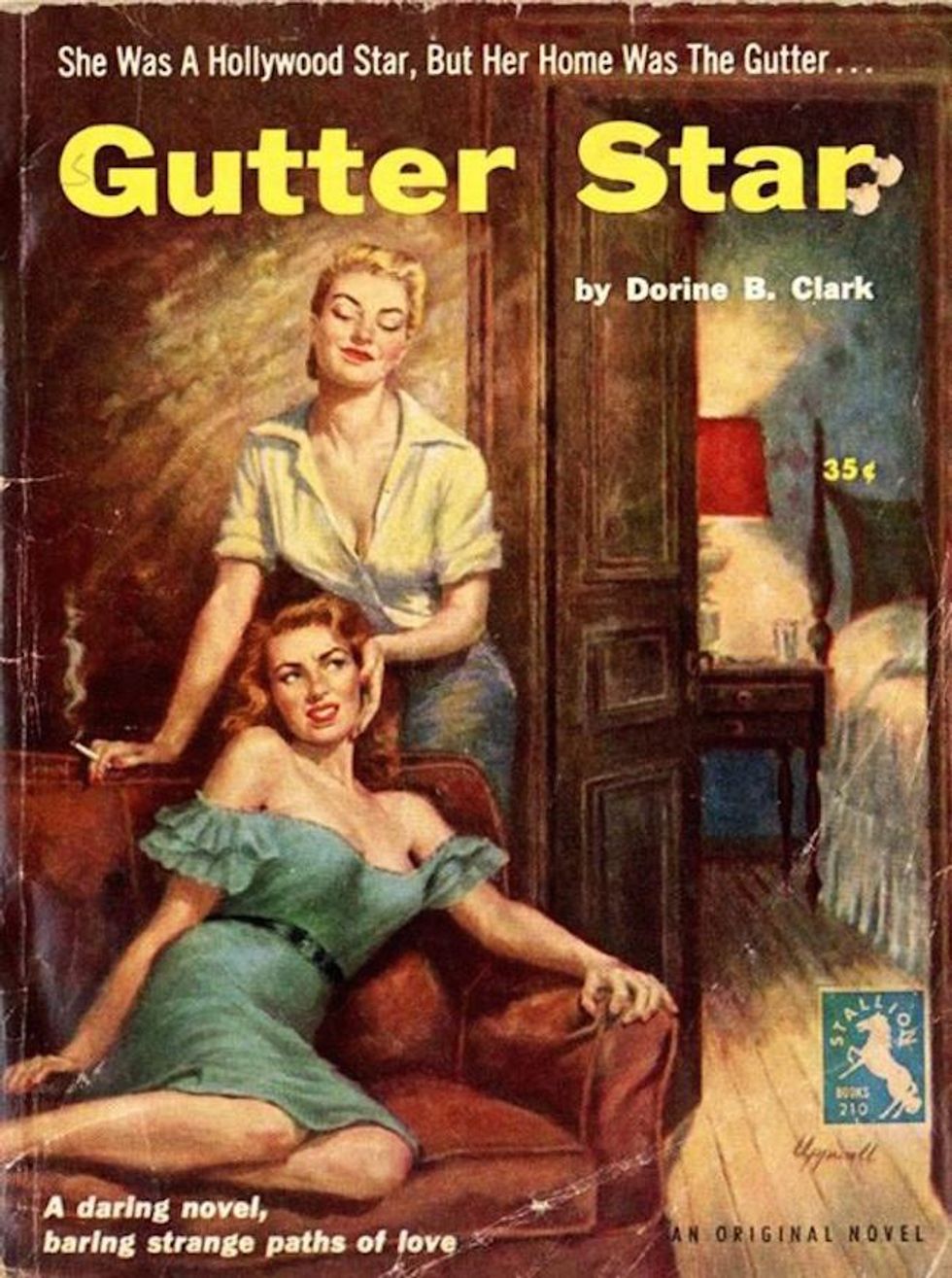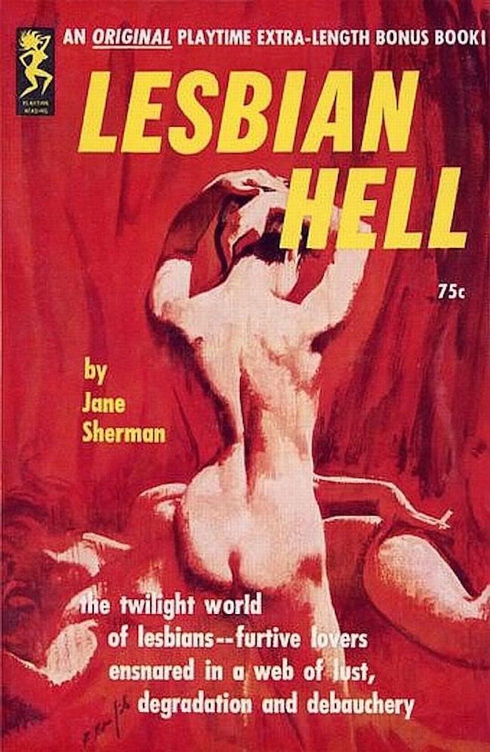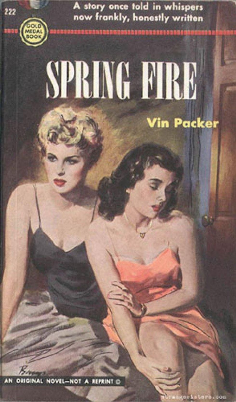 It’s hard to believe one of the best lesbian literary romances of all time was hidden behind this gaudy 1953 Bantam Books paperback edition. The Price of Salt (later published under the title and adapted to film as Carol) by Patricia Highsmith was first published in 1952 under the pseudonym Claire Morgan. The ending of the novel completely defied literary convention at the time, giving the main characters a chance at happiness. The book has clearly stood the test of time.