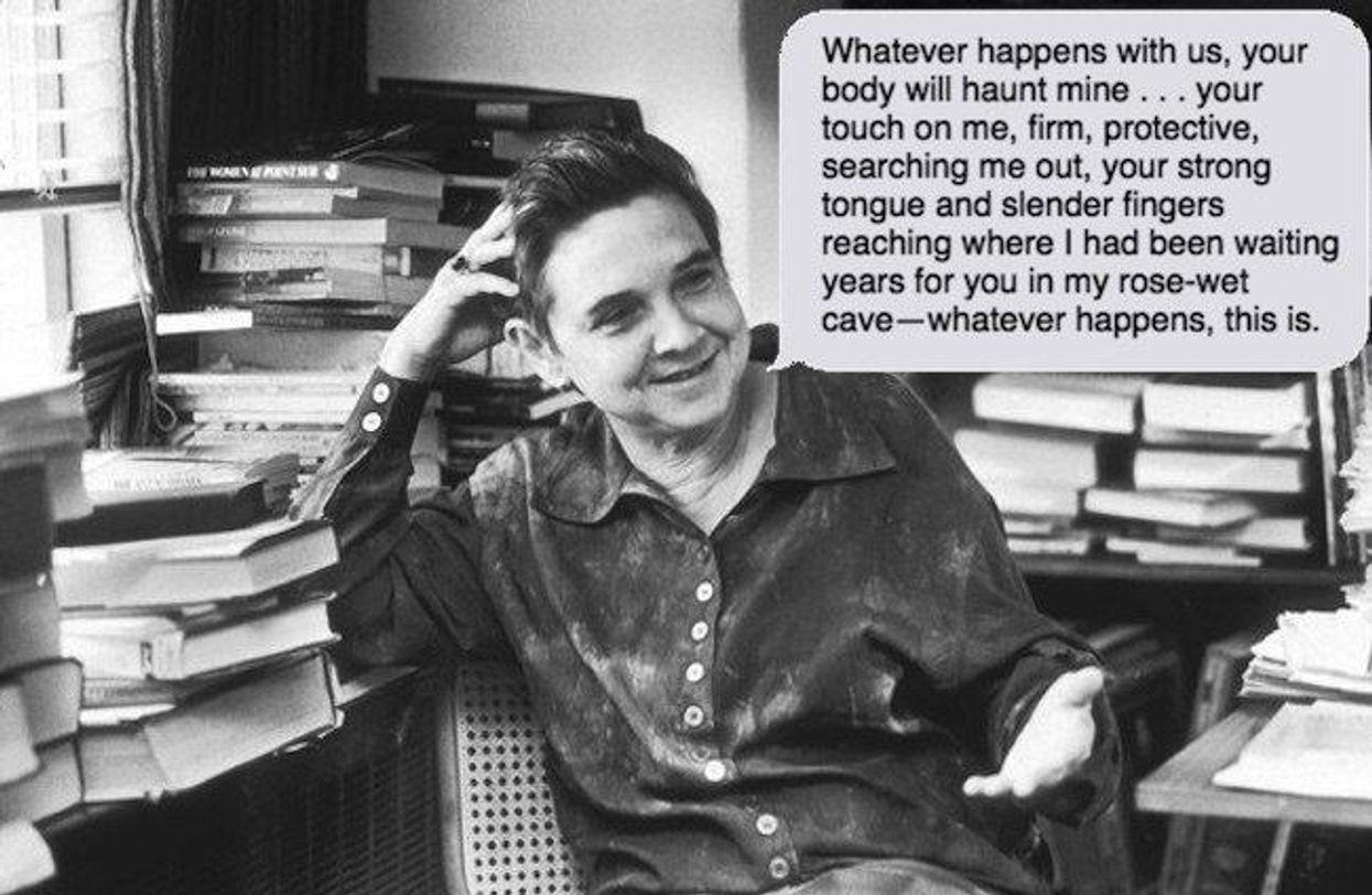 "Whatever happens with us, your body will haunt mine . . . your touch on me, firm, protective, searching me out, your strong tongue and slender fingers reaching where I had been waiting years for you in my rose-wet cave—whatever happens, this is."