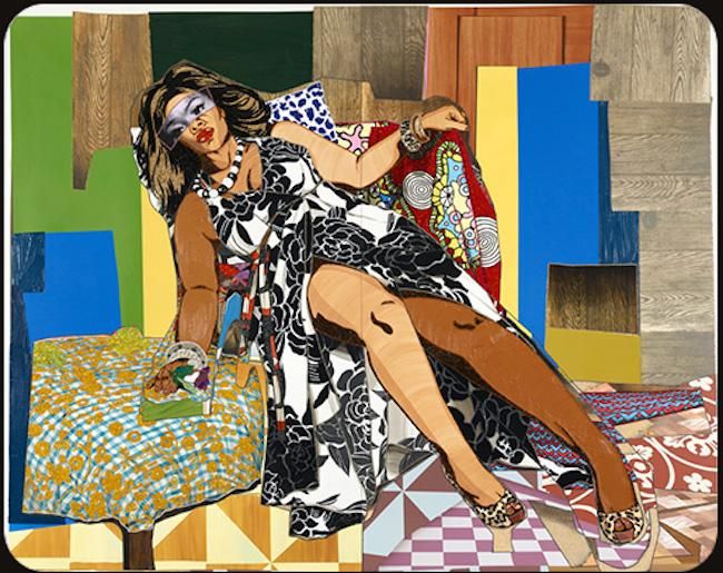 New York based artist Mickalene Thomas explores ideas around beauty, race, sexuality, gender, and femininity in her elaborate paintings composed of rhinestones, acrylic, and enamel. Pictured above: 'She Ain’t A Child No More #2' via the artist’s website.