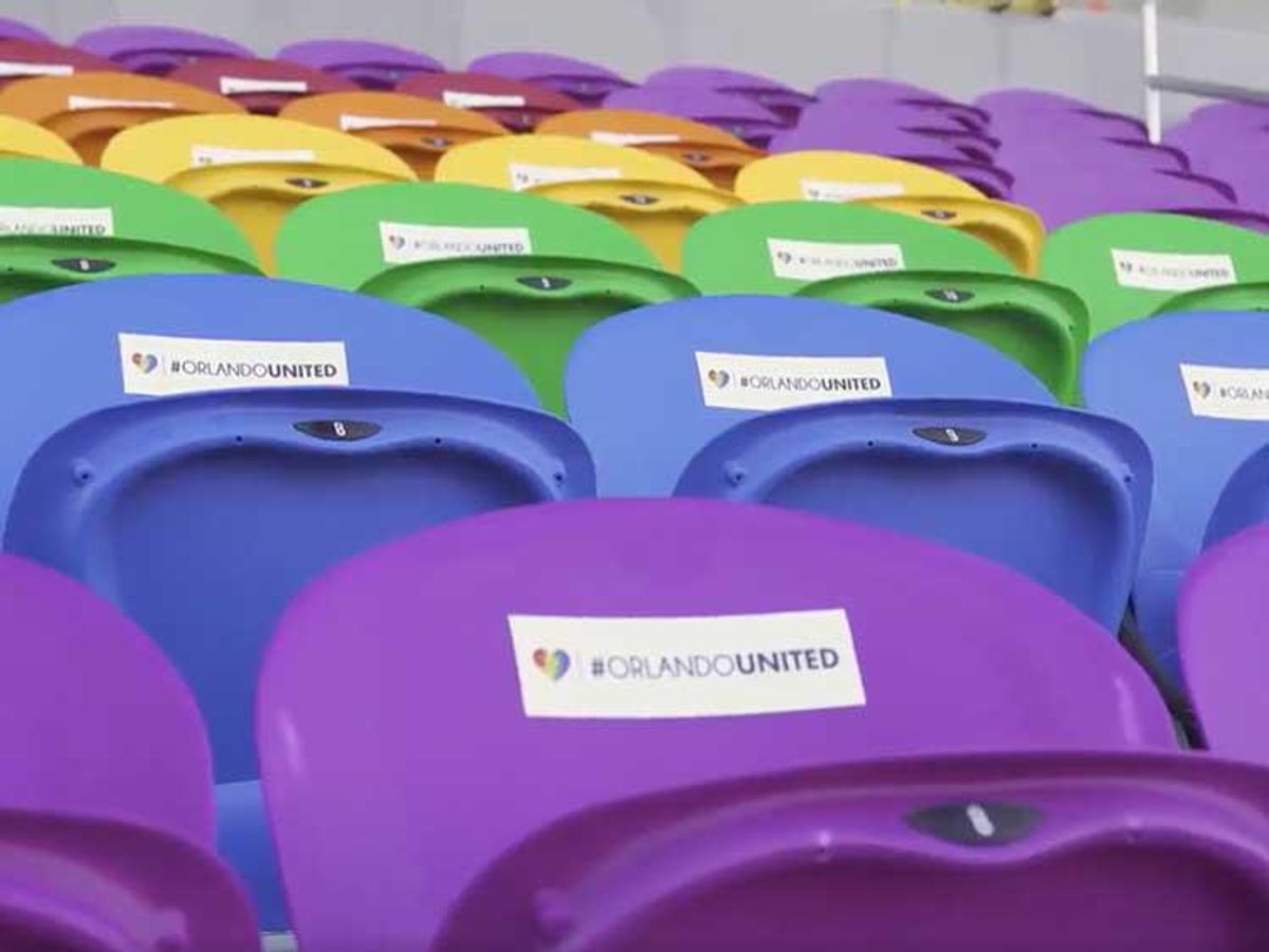 Not only are the seats arranged in the colors of a Pride flag rainbow, but each one is emblazoned with a rainbow heart and the hashtag “#OrlandoUnited,” according to LGBTQ Nation.