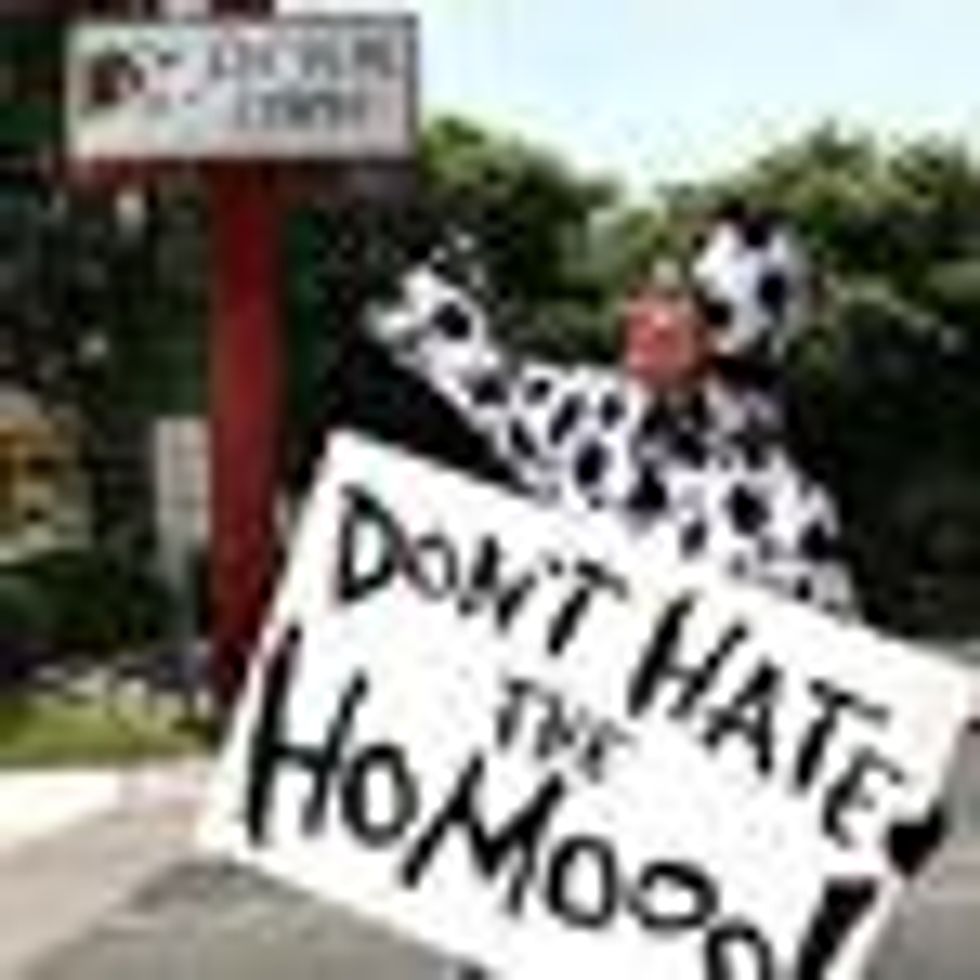 Gorman's photos show Kusko in her suit, with the background photoshopped to read "Gays Not Welcome," all in an effort to, as she says, "Keep the Mooooovement alive."