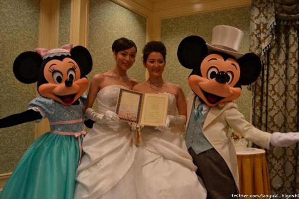 Japanese lesbian blogger Koyuki Higashi and her partner Hiroko made history earlier this month when they became the first same-sex couple to wed in Japan — at Tokyo Disney. Higashi tweeted the photo above of her and her new wife in princess-style white wedding gowns, flanked my Mickey and Minnie Mouse. "My love Hiroko and I wore wedding dresses and had a mini-parade at DisneySea, a place I also love," Hagashi tweeted after the ceremony.