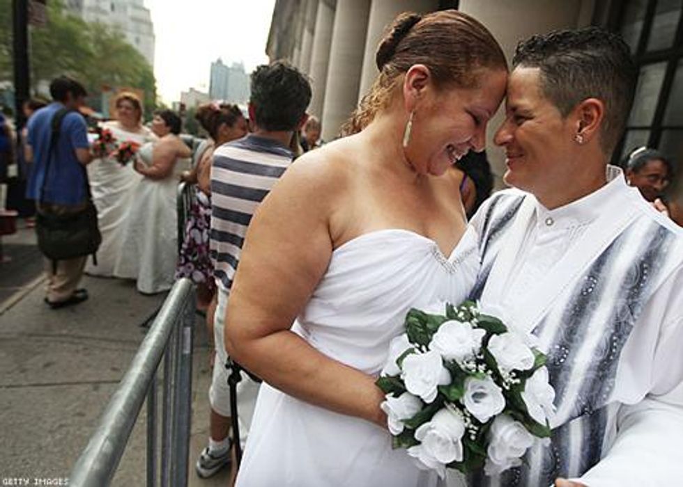 Also getting hitched on the first day it was legal in New York were Maira Garcia (right) and Maria Vargas, who waited in line to get married at the Brooklyn City Clerk's office.