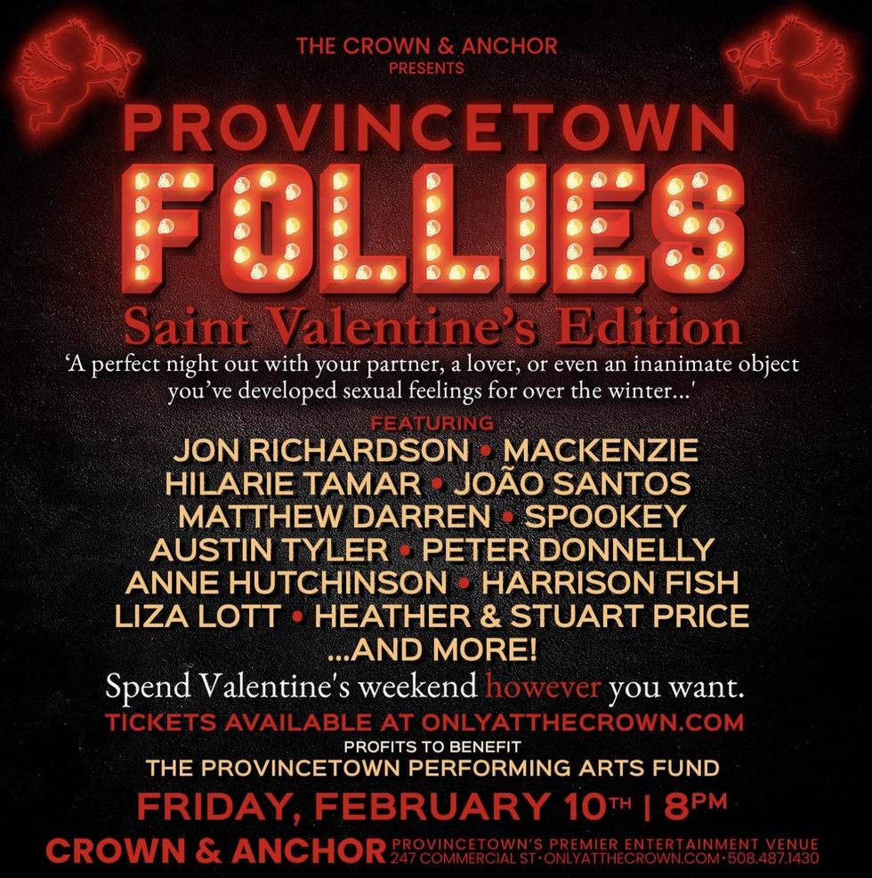 American Idol star, Matthew Darren, leads an all-star line up the Crown & Anchor "Provincetown Follies--Saint Valentine's Edition" of virtually every beloved performer in Provincetown! From the hysterics of Anne Hutchinson and Austin Tyler to the singing talents of Jon Richardson, Peter Donnelly, Joao Santos and crowd favorites, Mackenzie and Liz Lott, there is something for everyone!
