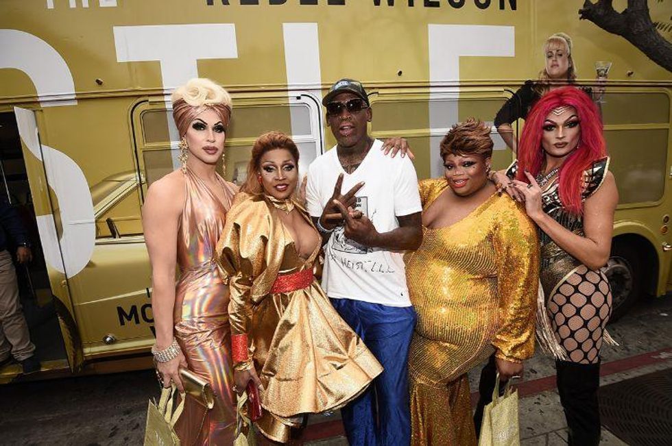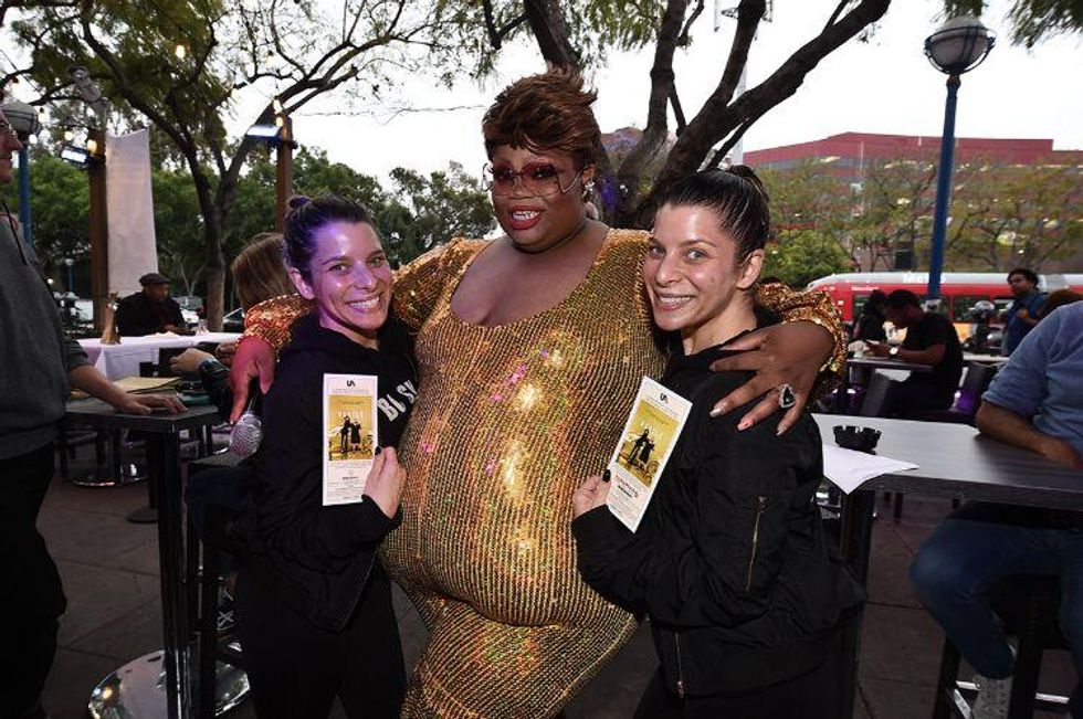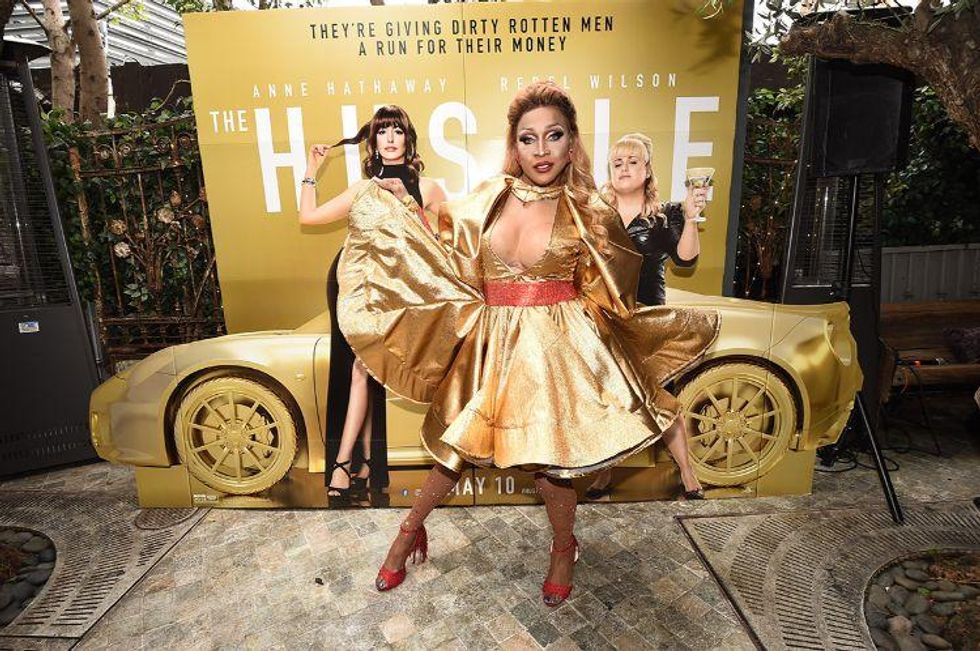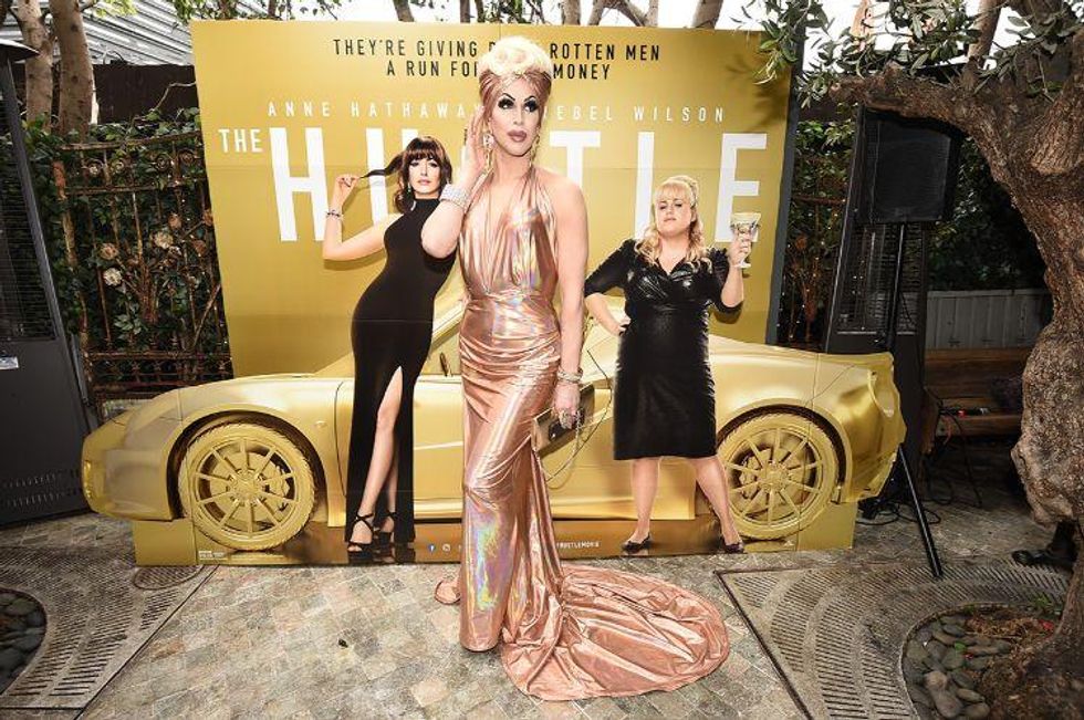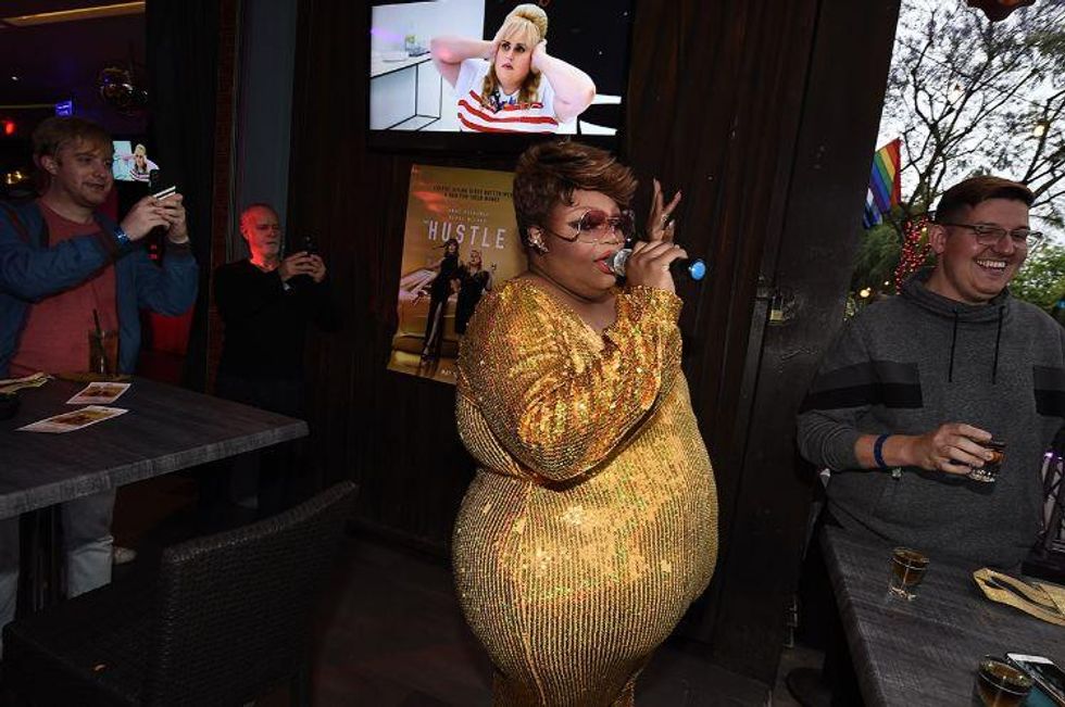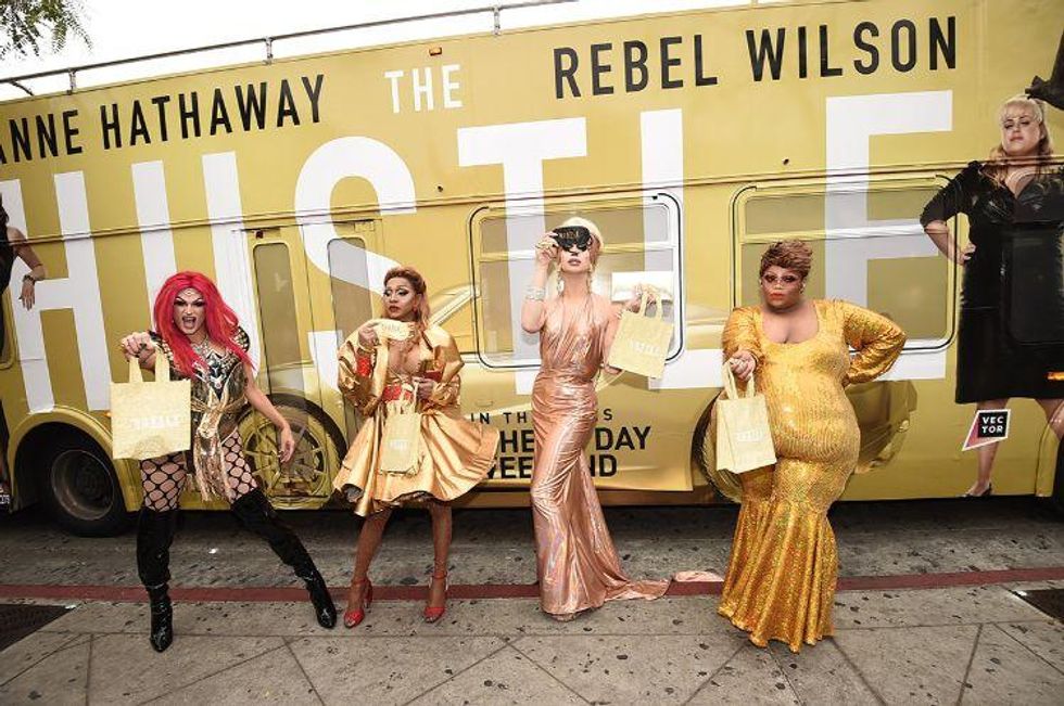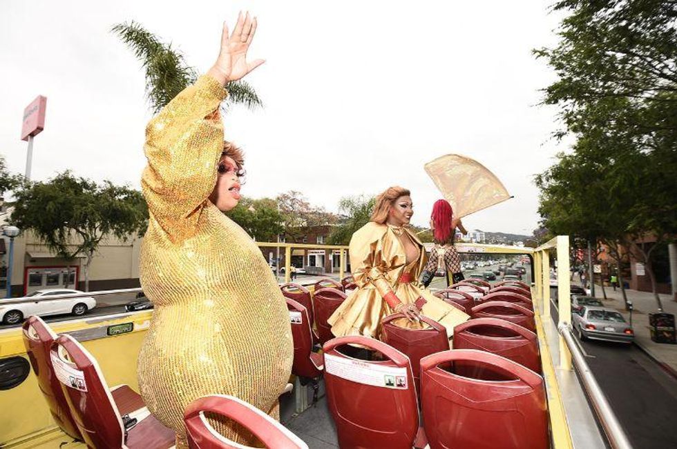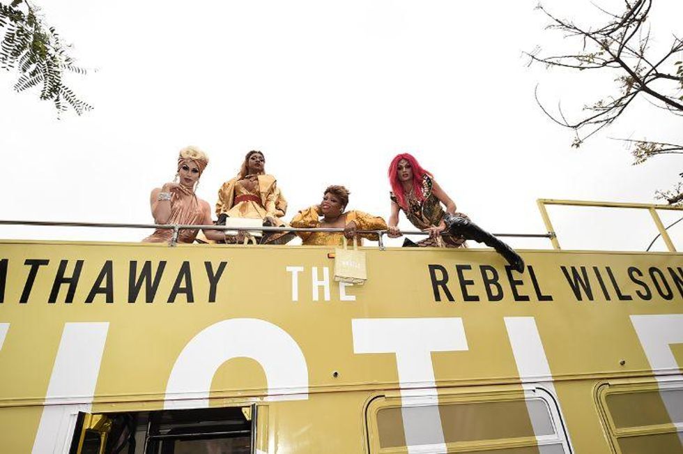 Last Thursday evening, the queens paraded down Santa Monica Boulevard on a double-decker bus plastered with Anne Hathaway and Rebel Wilson's face before making some pit stops at Mickey's, Pump, and Sur to give away massage prizes, gift cards, and more to fangirling local gays.