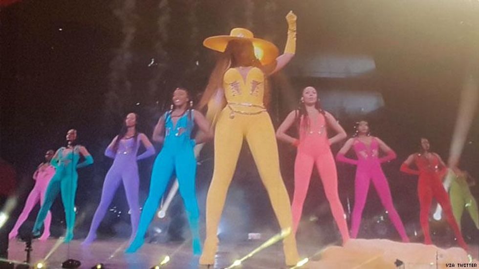 Queen Bey closed the show with a two-hour set and during her anthem "Formation," she came on stage in a skin-tight yellow jumpsuit, surrounded by her backup dances dressed in every color of the rainbow.
