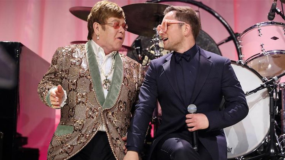 During last night's annual Elton John AIDS Foundation's Academy Awards viewing party, the queer music legend took to the stage with actor Taron Egerton and gave the crowd a stunning performance of his classic "Tiny Dancer."