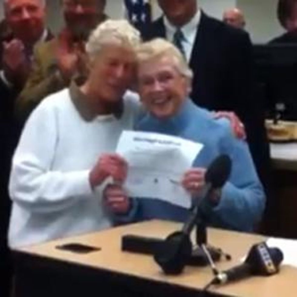The first to be awarded a marriage license in King County (which includes Seattle) were Jane Abbott Lighty, 77, and Pete-e Petersen, 85, a lesbian couple who have been together for more than 30 years. As King County Executive Dow Constantine used the same pen the Governor used to sign marriage equality into law to sign the women's marriage license, the Seattle Post-Intelligencer was there with a camera to record the historic moment. Watch that video below.