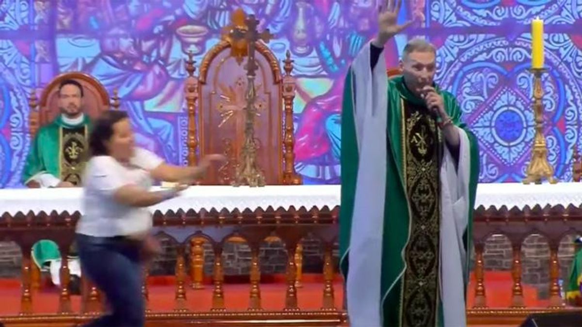 Father Marcelo Rossi was preaching to around 50,000 youths in Cachoeira Paulista, São Paulo on Sunday when a woman somehow got up on stage and pushed him right over the edge.