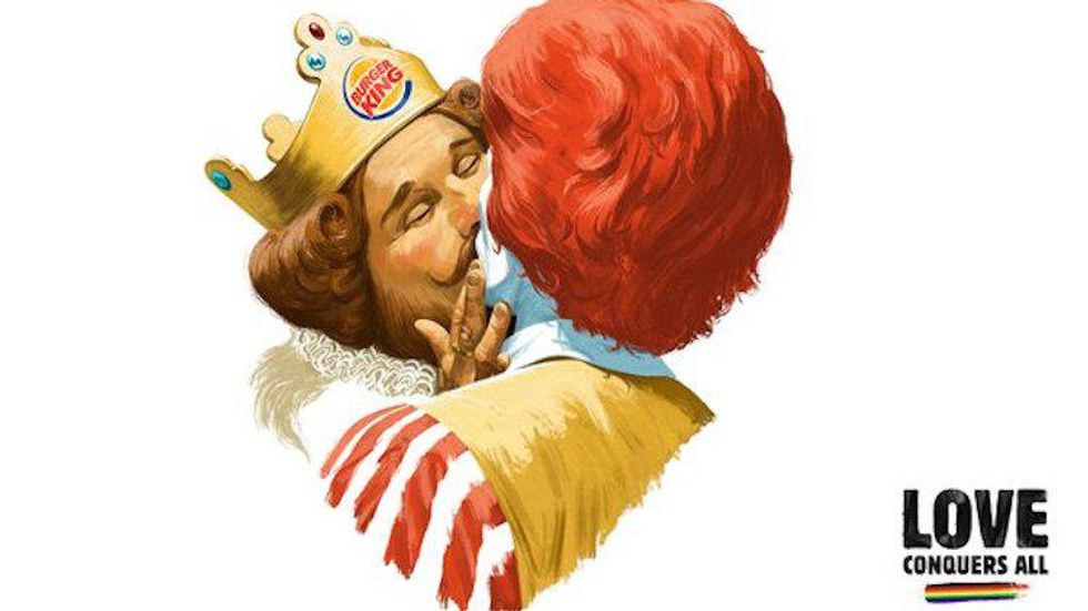 All the way over in Finland, Burger King is celebrating Helsinki Pride with an ad campaign of their royal mascot and Ronald McDonald kissing. "Love Conquers All," the ads read. The images have been spotted at bus stops around the city.