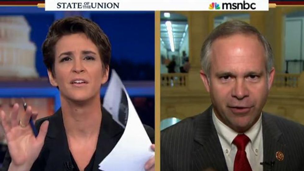 When Maddow tried to ask Huelskamp about his conspiracy-theorist tweets, which called Obama's administration an "Imperial Presidency," the GOP talking head started rattling off about the supposed Benghazi cover-up.