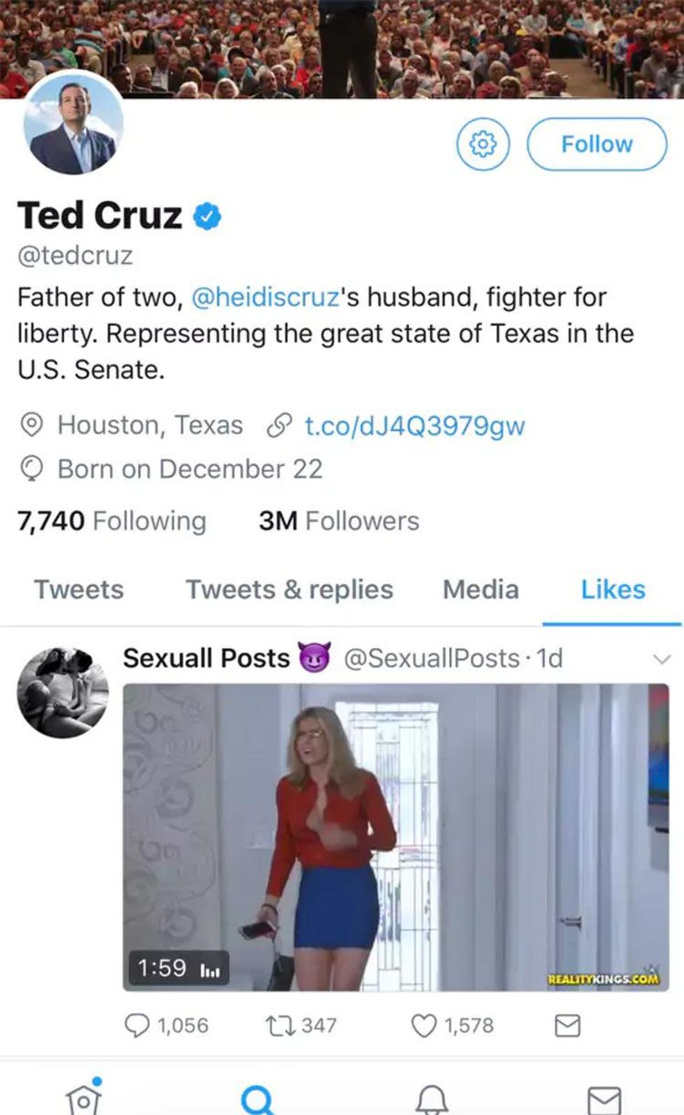 Texas Senator and past Republican presidential candidate Ted Cruz liked a hardcore porn video on Twitter yesterday. Yes, the same Ted Cruz who has previously defended a Texas state law banning the sale of sex toys and the same Ted Cruz who doesn’t believe that individuals have the right to masturbate.