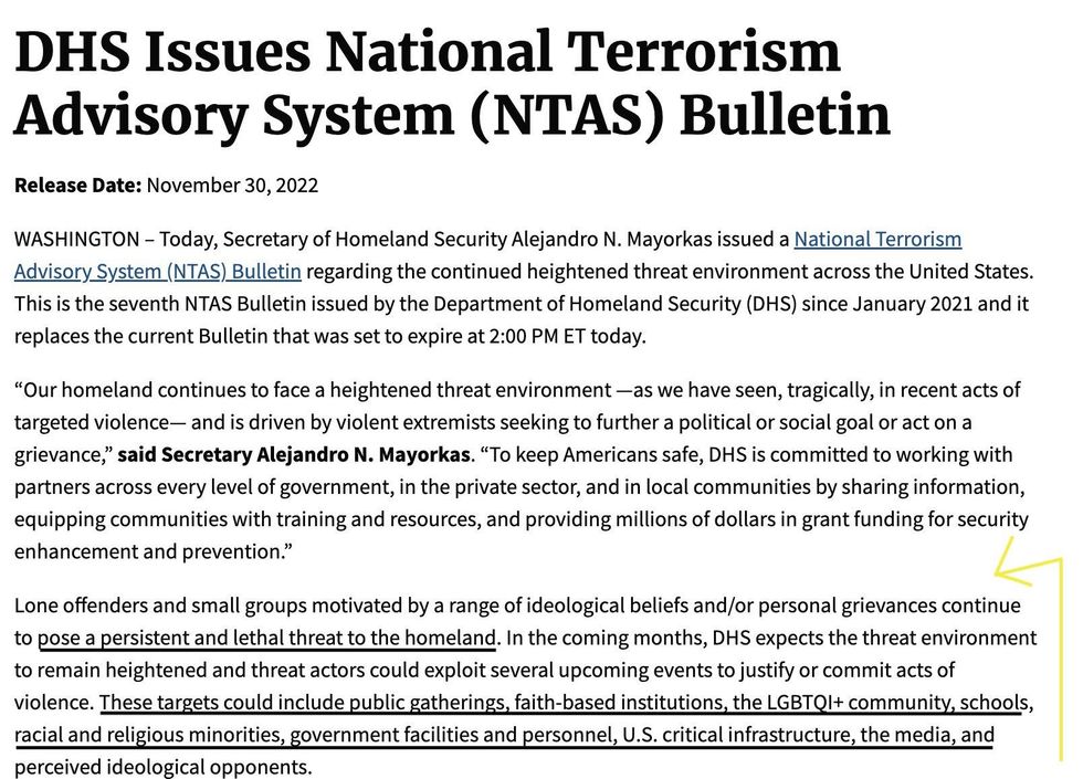 \u201cLiterally the Department of Homeland Security has declared us to be in a heightened threat environment for terrorism, based on recent attacks on the LGBT+ community, threats against the Jewish community, voter intimidation, and the attack on Pelosi's husband.\u201d— SaffronBurke \ud83d\udc00 (@SaffronBurke \ud83d\udc00) 1670271968