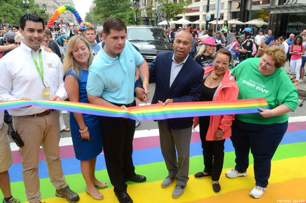 The ribbon-cutting came at the start of the parade at the corner of Boylston and Clarendon Streets, at the rainbow crosswalk that was painted especially for Boston Pride. From left to right: Sylvain Bruni (Boston Pride president), Lorrie Higgins (girlfriend of Mayor Walsh), Mayor Martin J. Walsh, Gov, Deval L. Patrick, his wife, Diane Patrick, and Linda DeMarco (Boston Pride vice president,)
