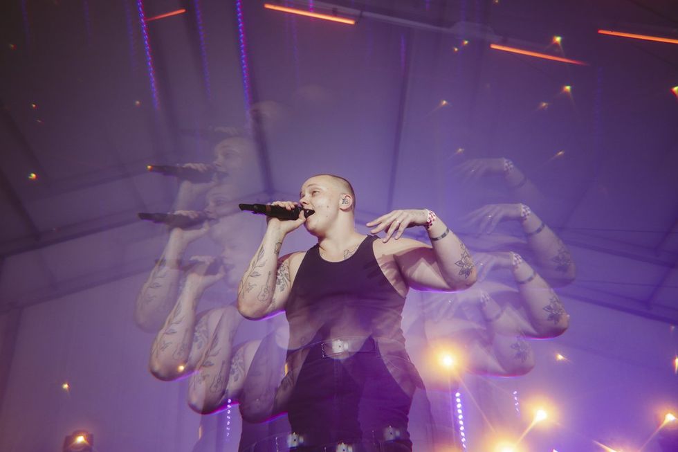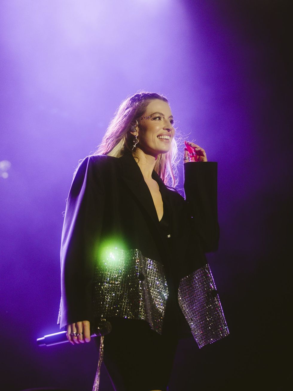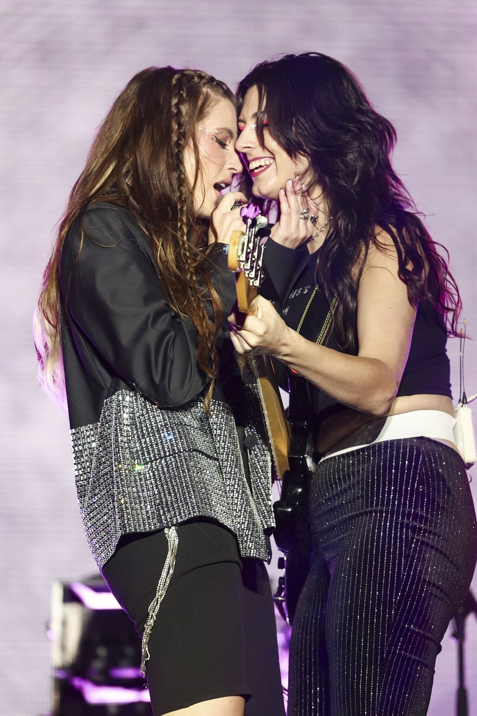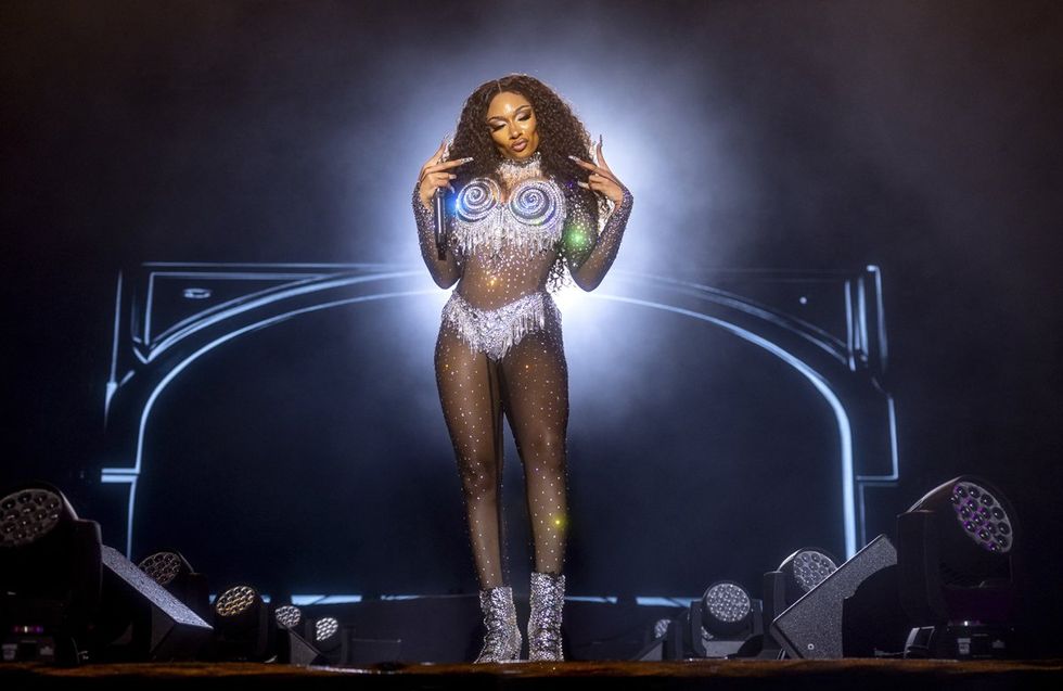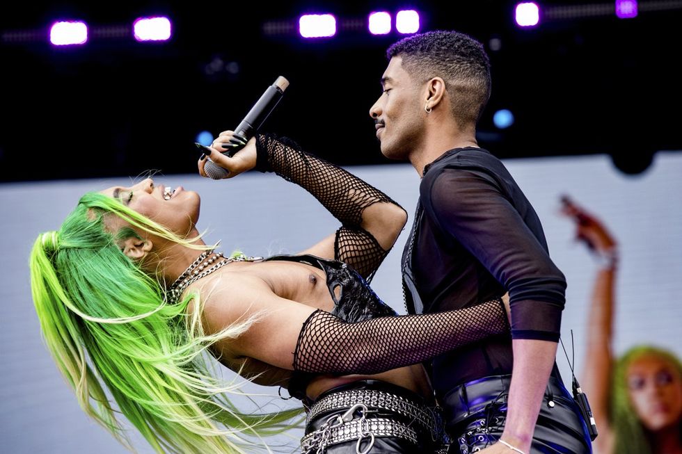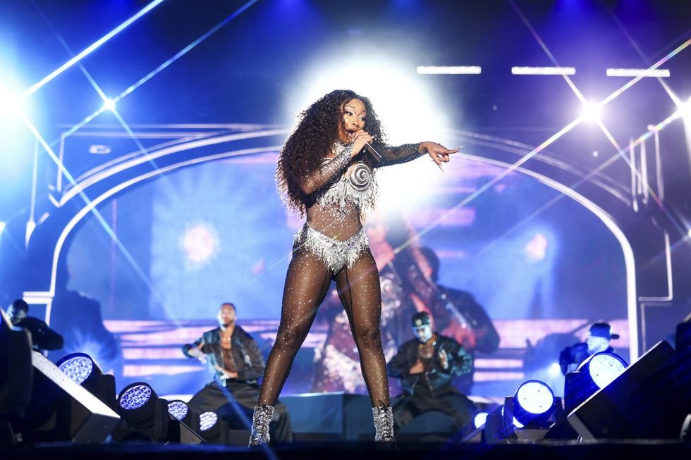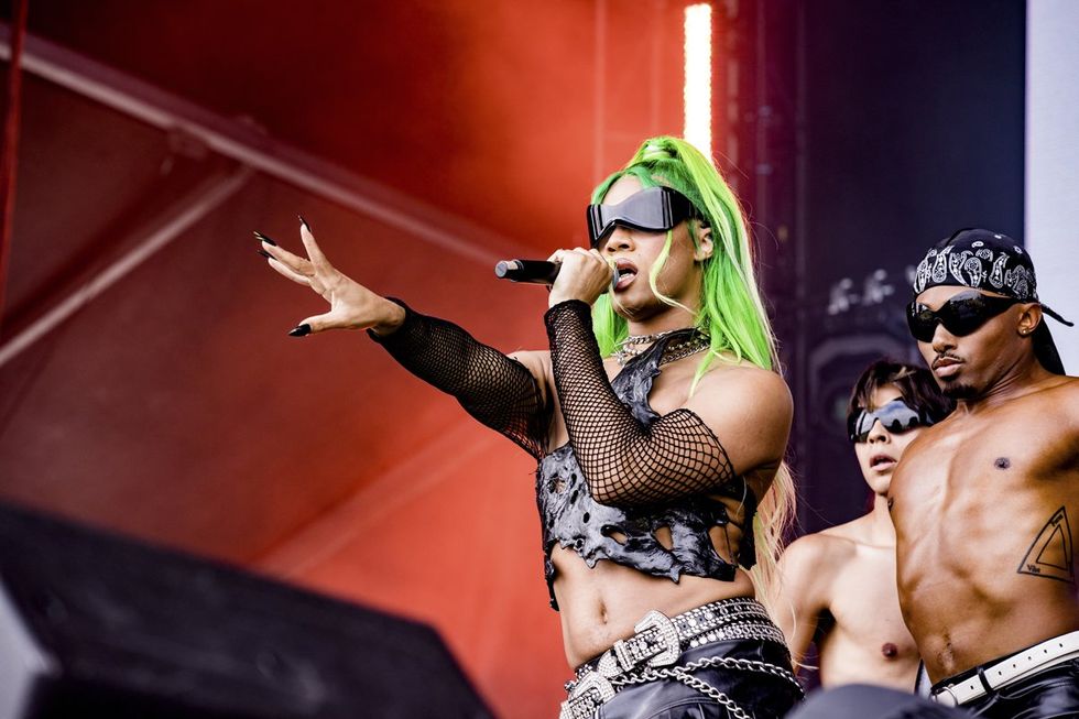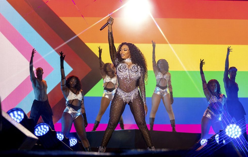 Megan Thee Stallion, Friday night’s headliner on the Main Stage, shimmered head to toe in a crystal bodysuit. She performed her biggest hits including “Savage” and “Body.” The Grammy Award winner invited fans onto the stage for a dance-off and even joined in on the fun. She continued to keep the crowd electric as she moved across the stage while fans sang every lyric to her songs. She later delivered an inspiring speech about self-acceptance which fans praised. She concluded her performance with a powerful visual as she posed center stage with her dancers surrounding her, fists in the air as they stood in front of a giant screen that displayed the Pride flag.