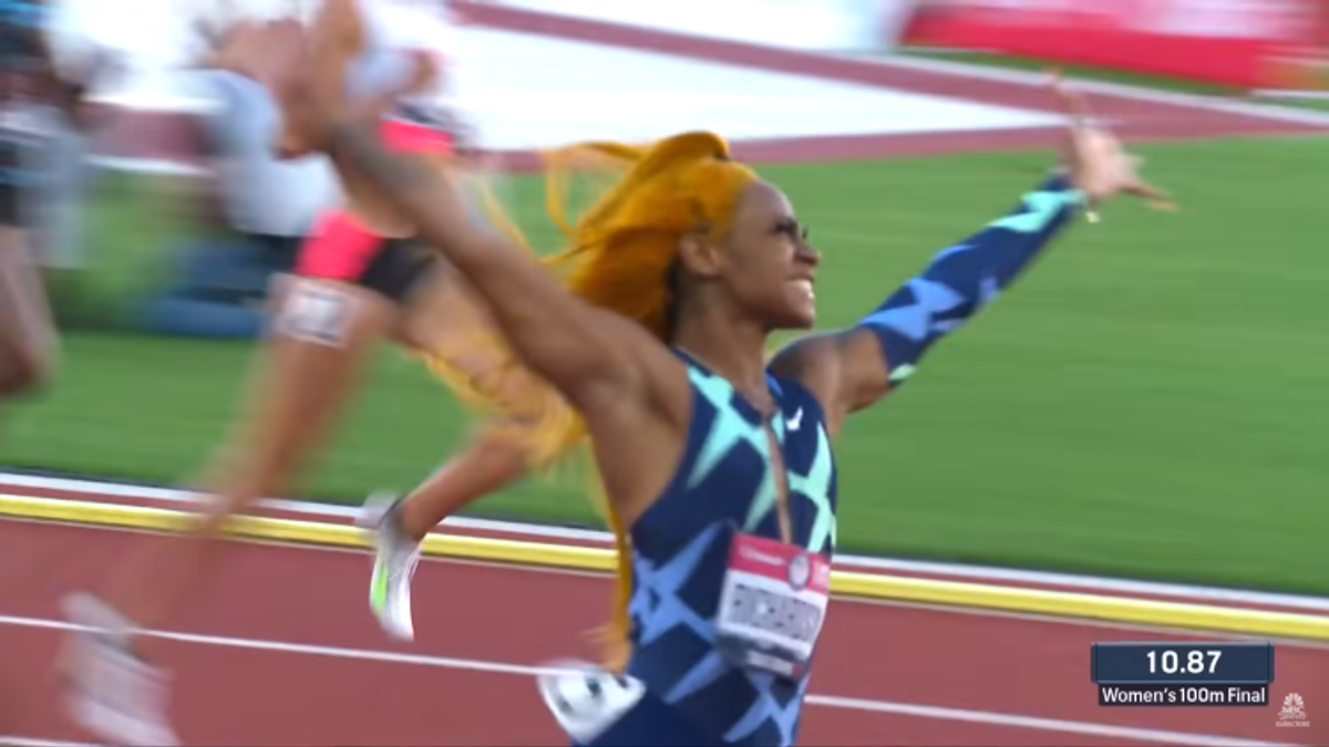 The sprinter won the 100-meter dash in 10.86 seconds at the Olympic Trials in Eugene, Oregon. According to LGBTQ Nation, that is the sixth-fastest legal time ever recorded professionally to date.